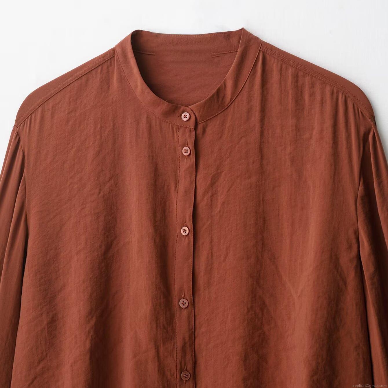 • Women's Loose Casual Two-Piece Set Polyester Rust Red Long Sleeve Stand Collar Button Down Shirt And Drawstring Wide Leg Pants Suit For Daily Office Loungewear