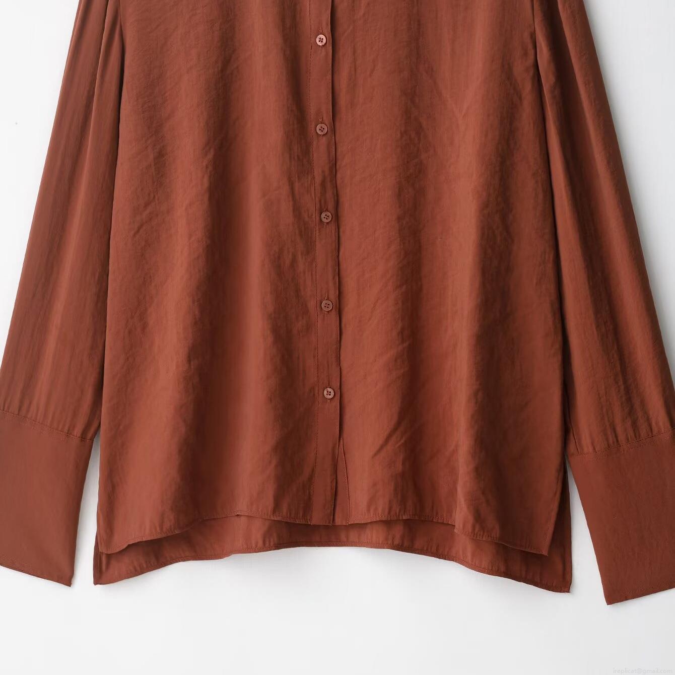 Women's Loose Casual Two-Piece Set Polyester Rust Red Long Sleeve Stand Collar Button Down Shirt And Drawstring Wide Leg Pants Suit For Daily Office Loungewear