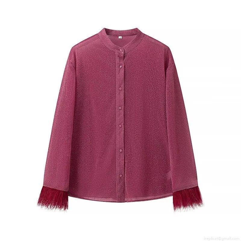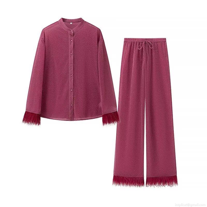 • Women's Luxury Lurex Ostrich Feather Trim Shirt And Wide Leg Pants Two Piece Set Elegant Stand Collar Long Sleeve Blouse And Trousers Party Outfits