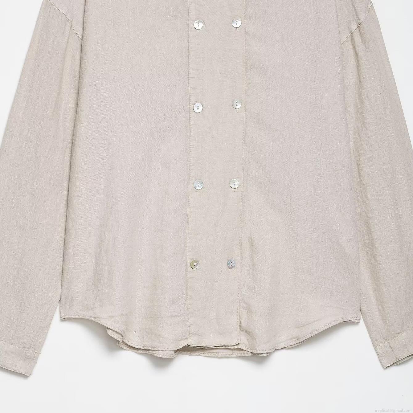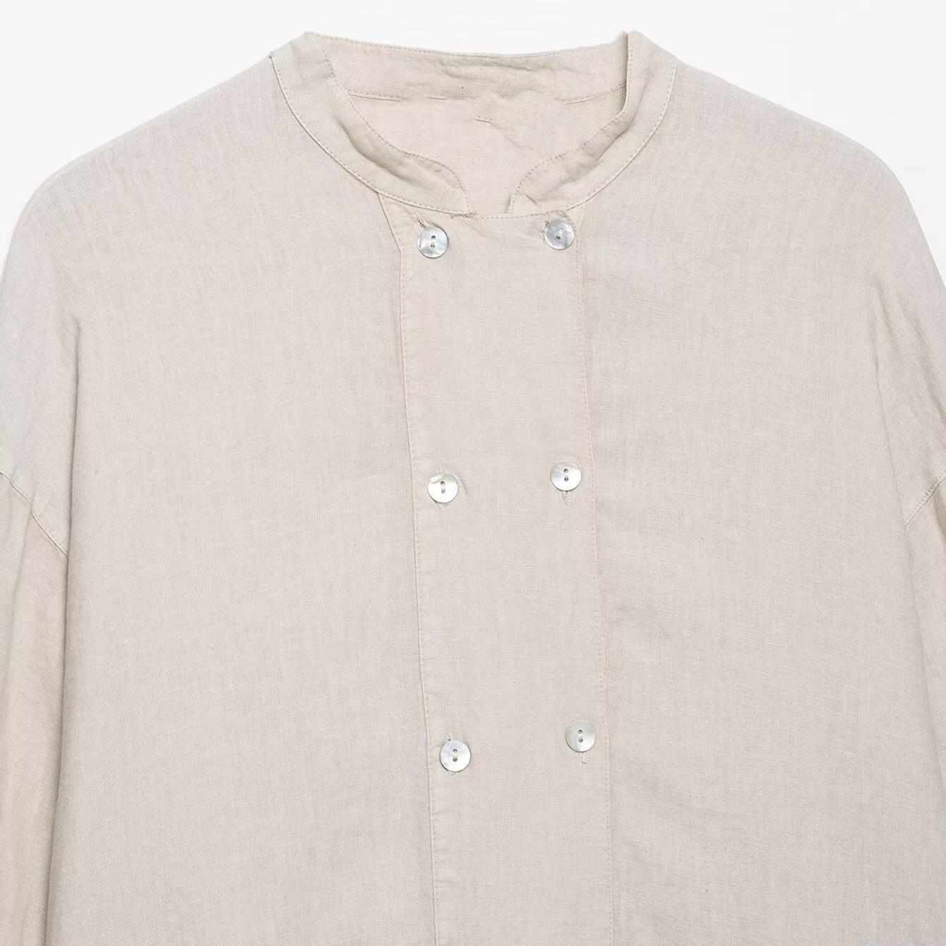 • Women's Minimalist 2 Piece Pants Set Long Sleeve Stand Collar Double Breasted Shirt And Wide Leg Trousers Casual Polyester Linen-Like Outfit Office Lady Beige