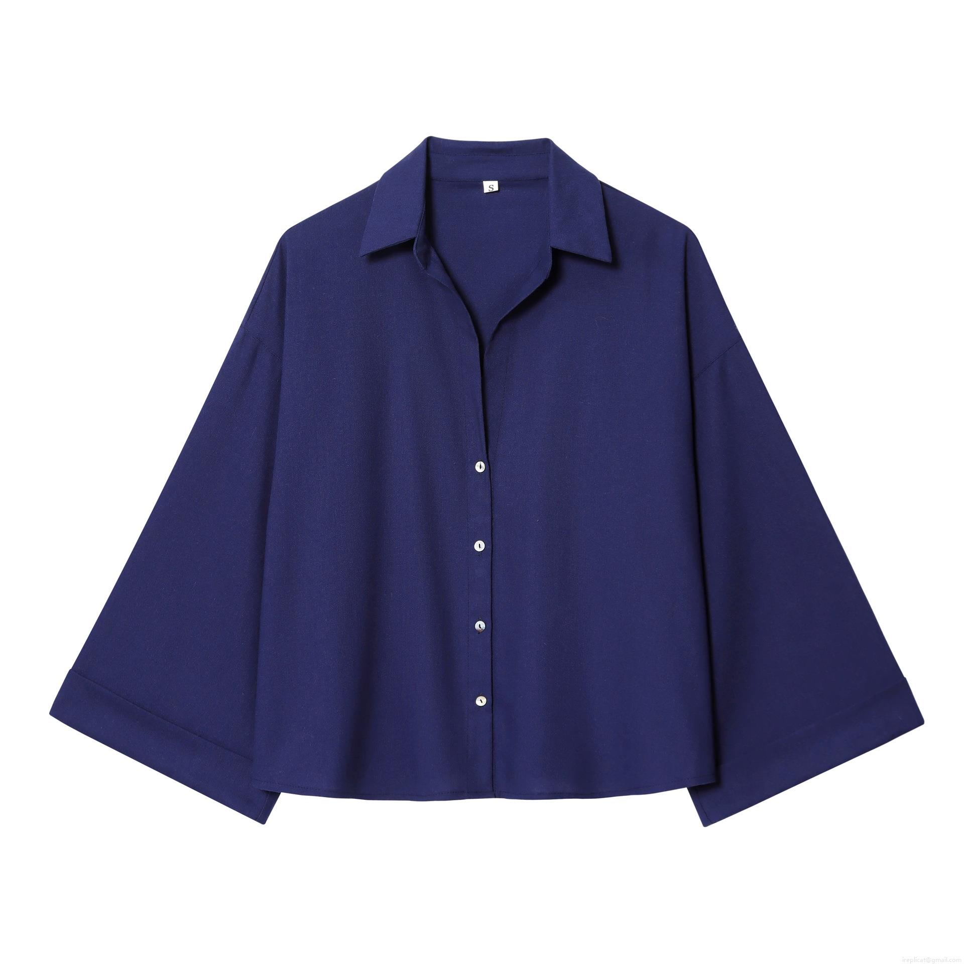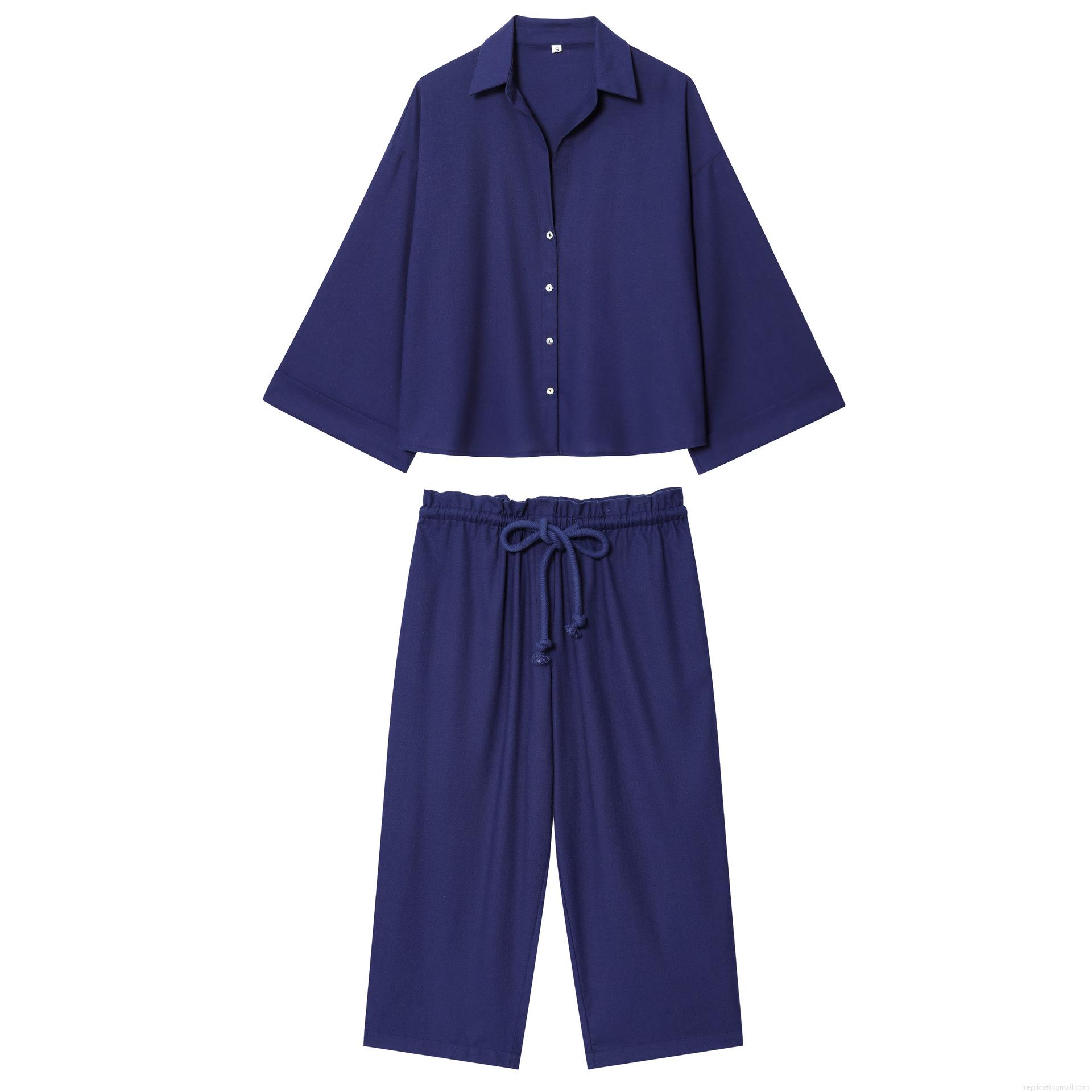 • Women's Minimalist Two Piece Set Polyester Blend Long Sleeve Button Up Shirt and Wide Leg Pants Suit Casual Daily Lounge Streetwear Solid Color Navy Blue