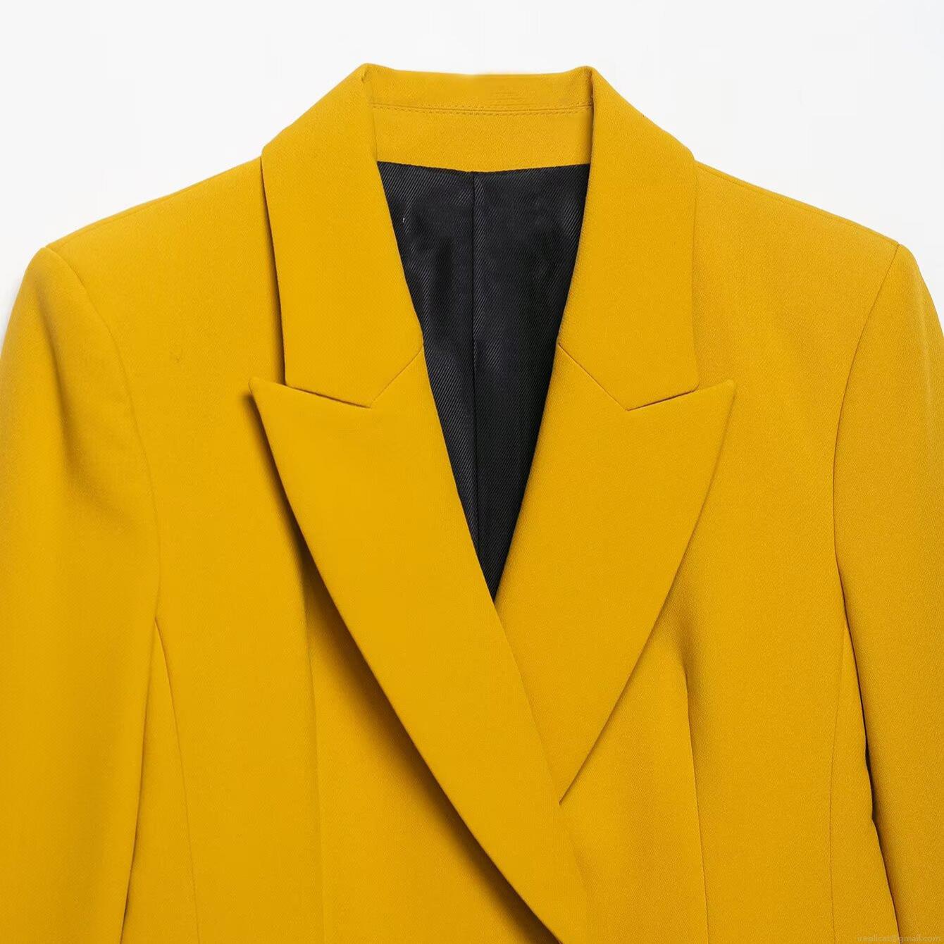 Women's Mustard Yellow Woven Blazer Suit Set Double Breasted Professional Office Jacket And High Waist Straight Leg Pants Two Piece Outfit