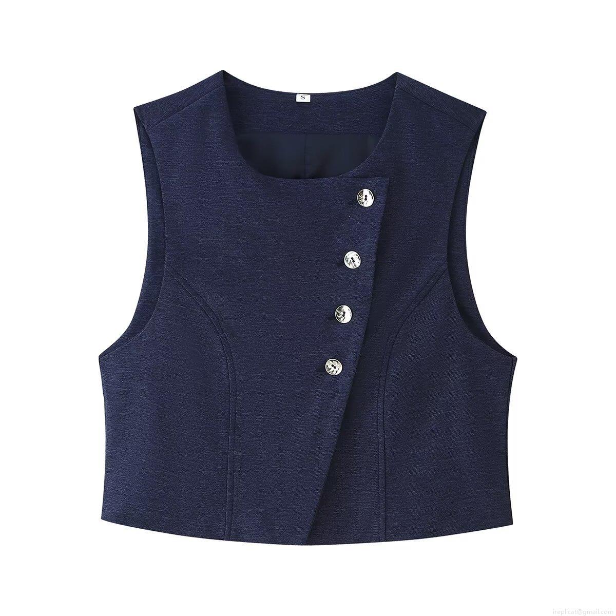 Women's Navy Blue Polyester Vest And High Waist Wide Leg Pants Two Piece Outfits Elegant Solid Color Sleeveless Top And Asymmetric Trousers Set For Commute Streetwear Casual Fashion Suits