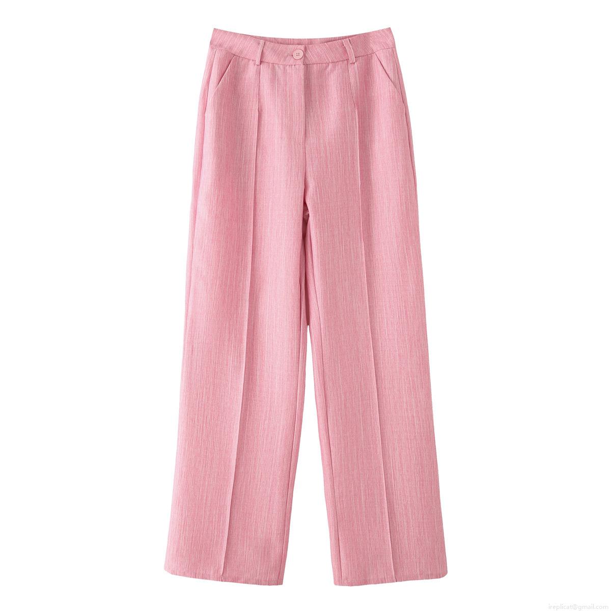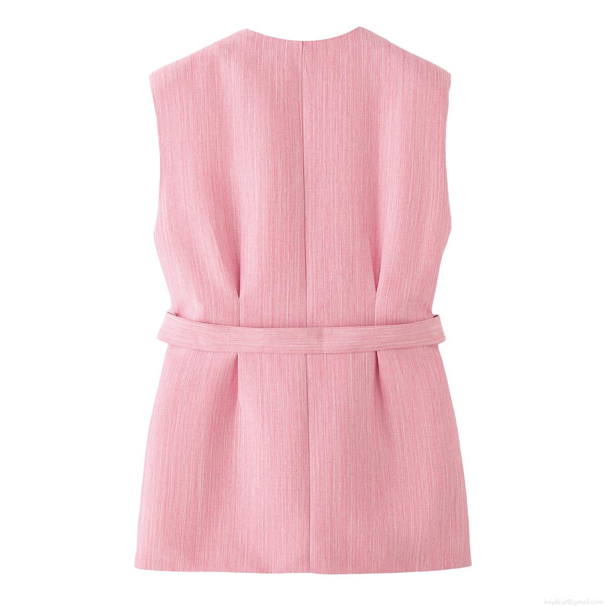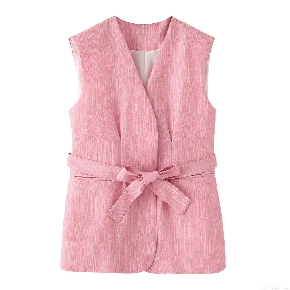 • Women's Pink 2 Piece Suit Sleeveless Tie Waist V Neck Vest And High Waist Wide Leg Pants Set Slub Texture Polyester Casual Streetwear Outfits