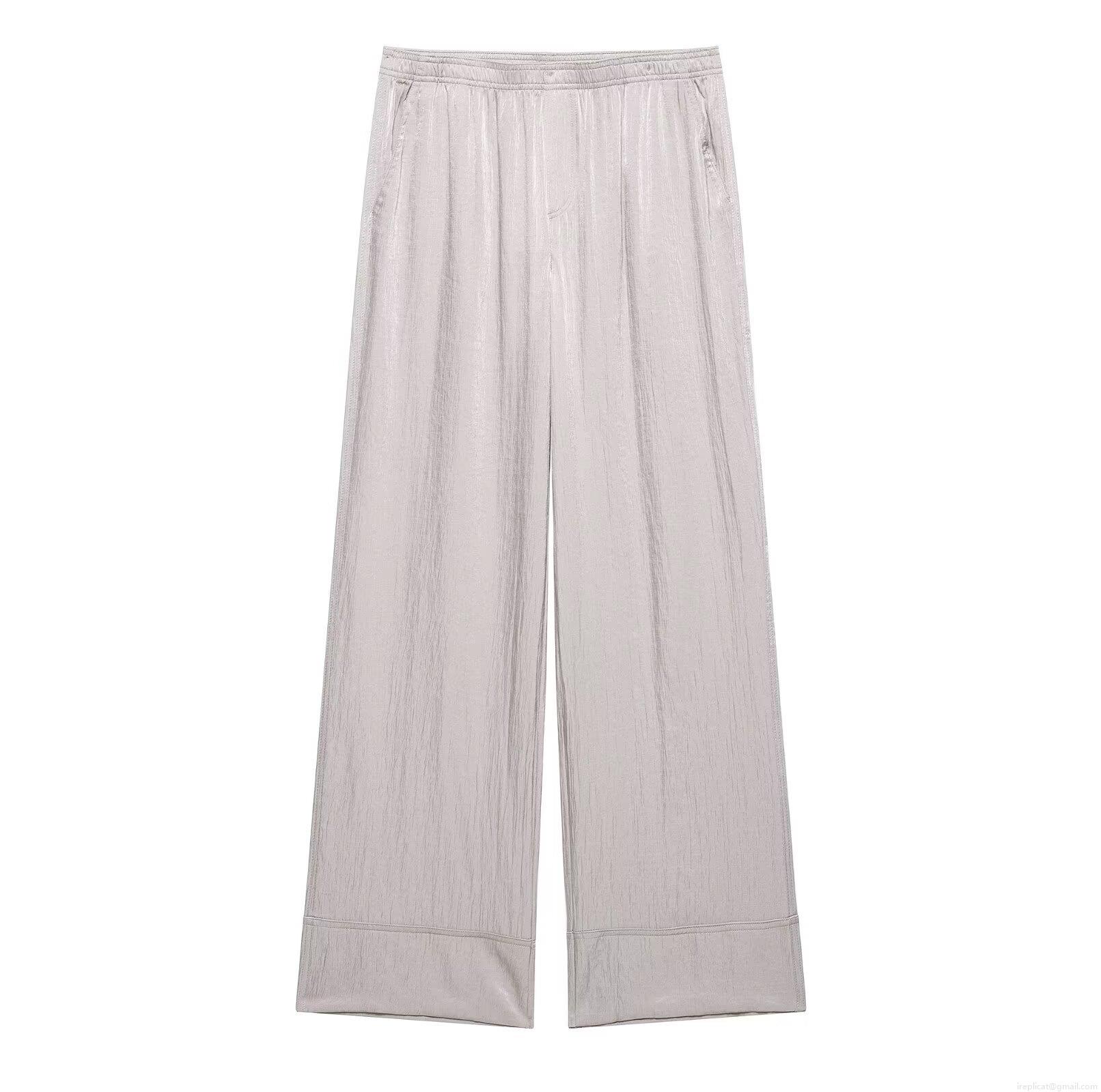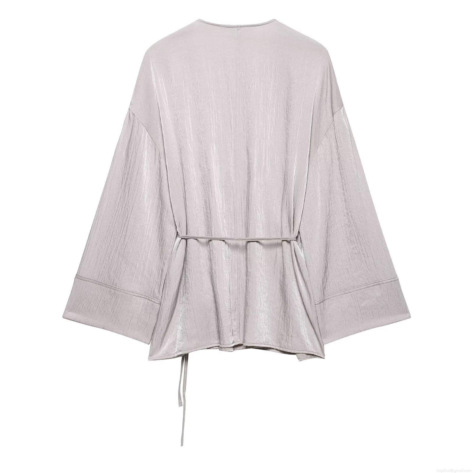 • Women's Pleated Satin Two Piece Outfits Kimono Style Wrap Tie Side V Neck Top And Wide Leg Pants Set Solid Color Casual Lounge Wear Streetwear