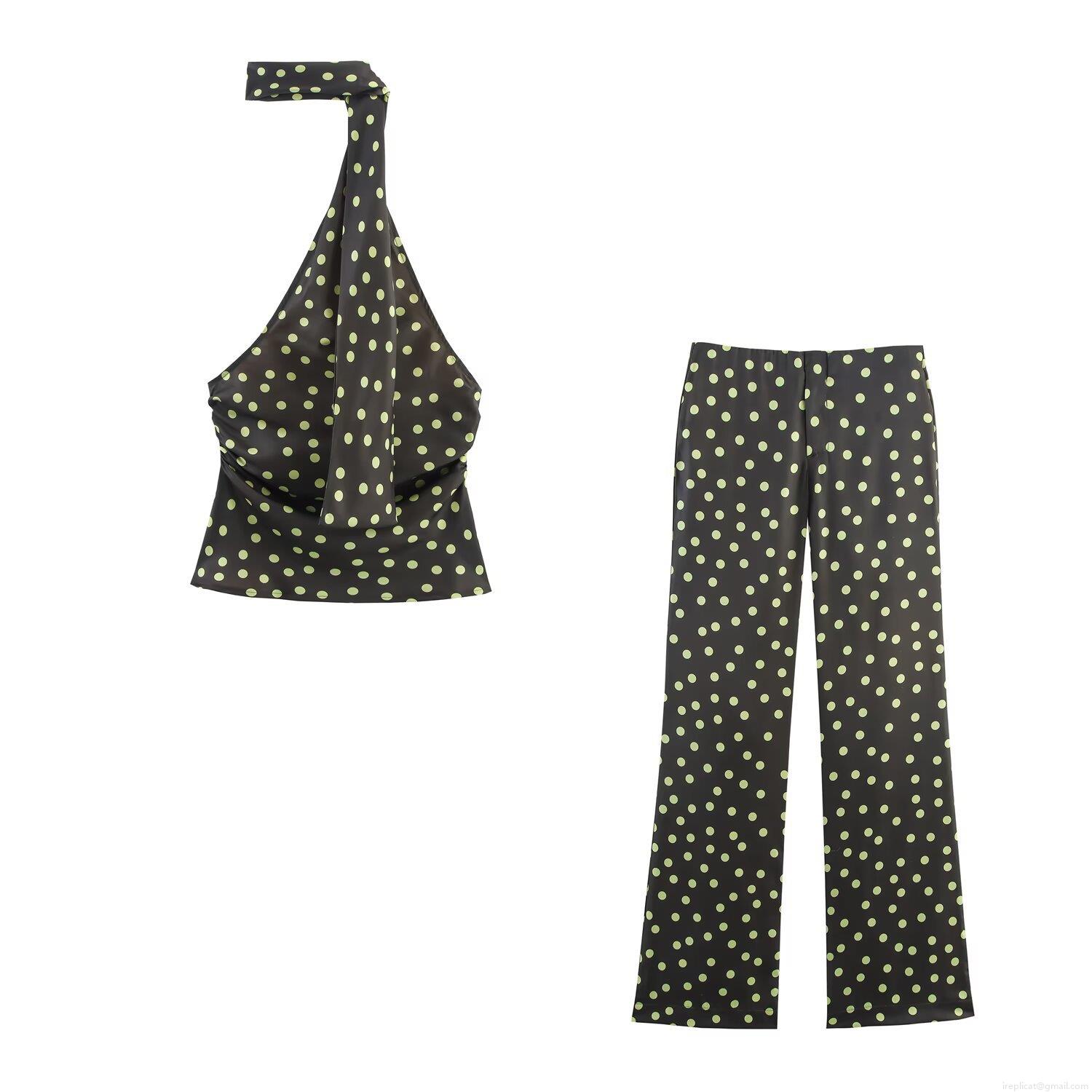 • Women's Polka Dot Halter Neck Top And Flared Pants Set Satin Texture Backless Sexy Two Piece Outfits For Daily Party Vacation Chic Summer Autumn Wear