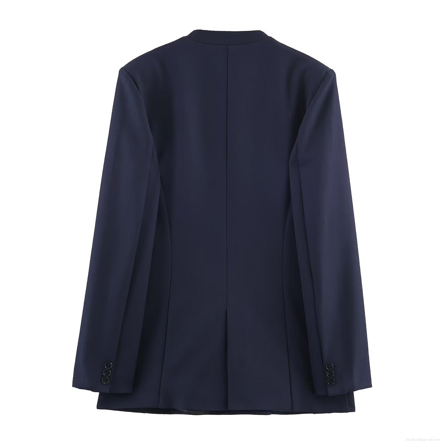 • Women's Professional Office Suit Set No-Collar Double Breasted Blazer and Straight Leg Pants 2 Piece Set Autumn Western Style Commuter Polyester Solid Color Deep Blue Business Outfit