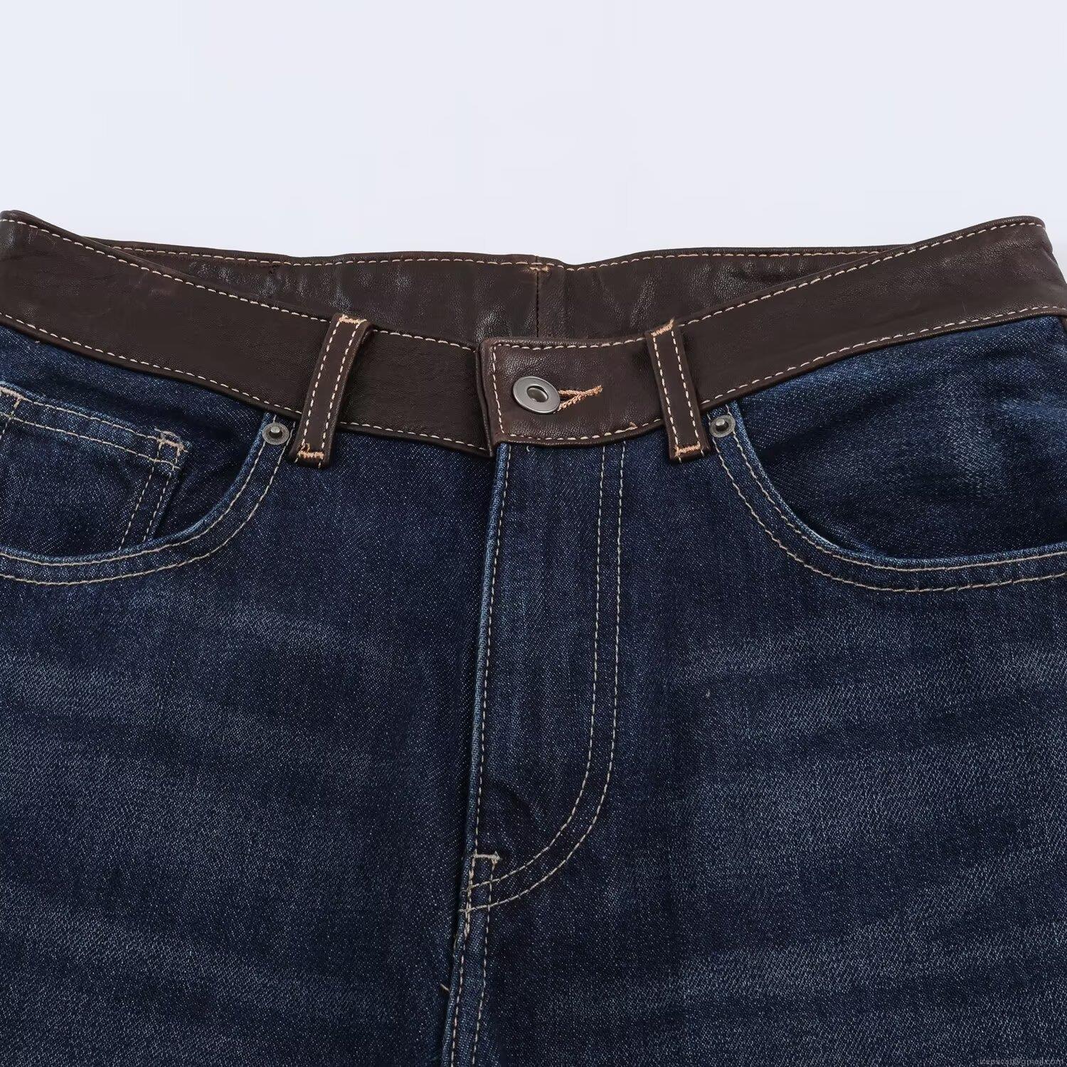 Women's Retro Casual Denim Jacket and Trousers Set Patchwork Leather Two-Piece Outfit Contrast Stitching Winter Streetwear Fashion Suit