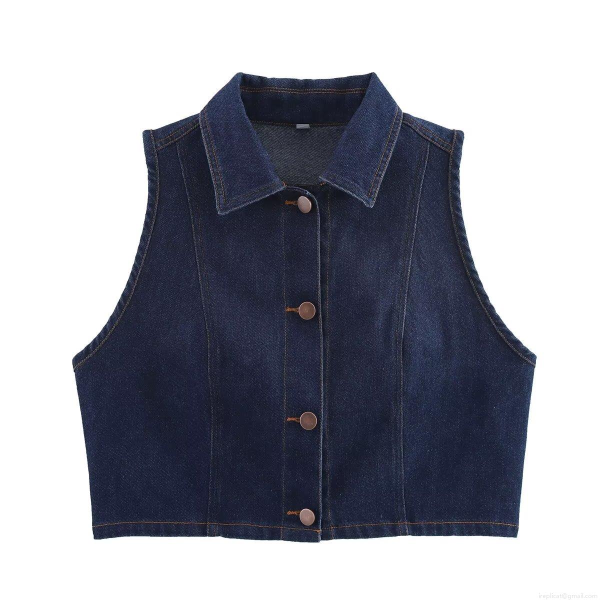 Women's Retro Dark Blue Denim Look Two Piece Set Fashion Lapel Sleeveless Vest And Belted Wide Leg Pants Casual Polyester Woven Waistcoat And Trousers Outfit For Streetwear
