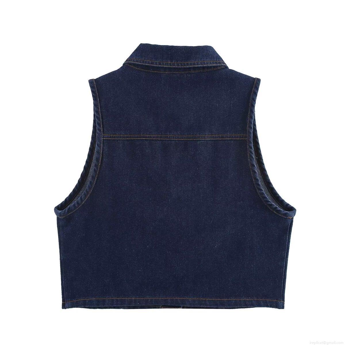 • Women's Retro Dark Blue Denim Look Two Piece Set Fashion Lapel Sleeveless Vest And Belted Wide Leg Pants Casual Polyester Woven Waistcoat And Trousers Outfit For Streetwear
