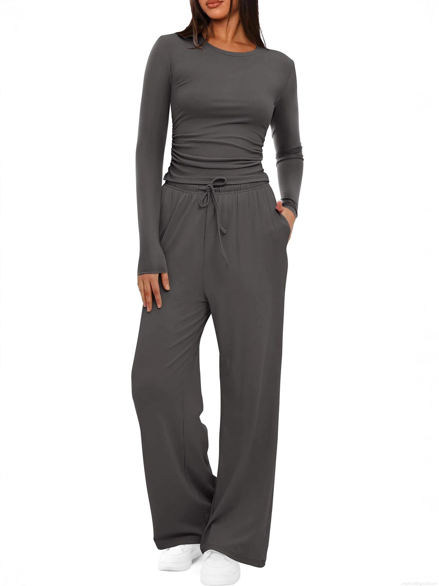 • Women's Ribbed Knit Two Piece Set Long Sleeve Slim Top And High Waist Drawstring Wide Leg Pants Casual Lounge Commute Sweatsuit Solid Color Tracksuit For Autumn Winter