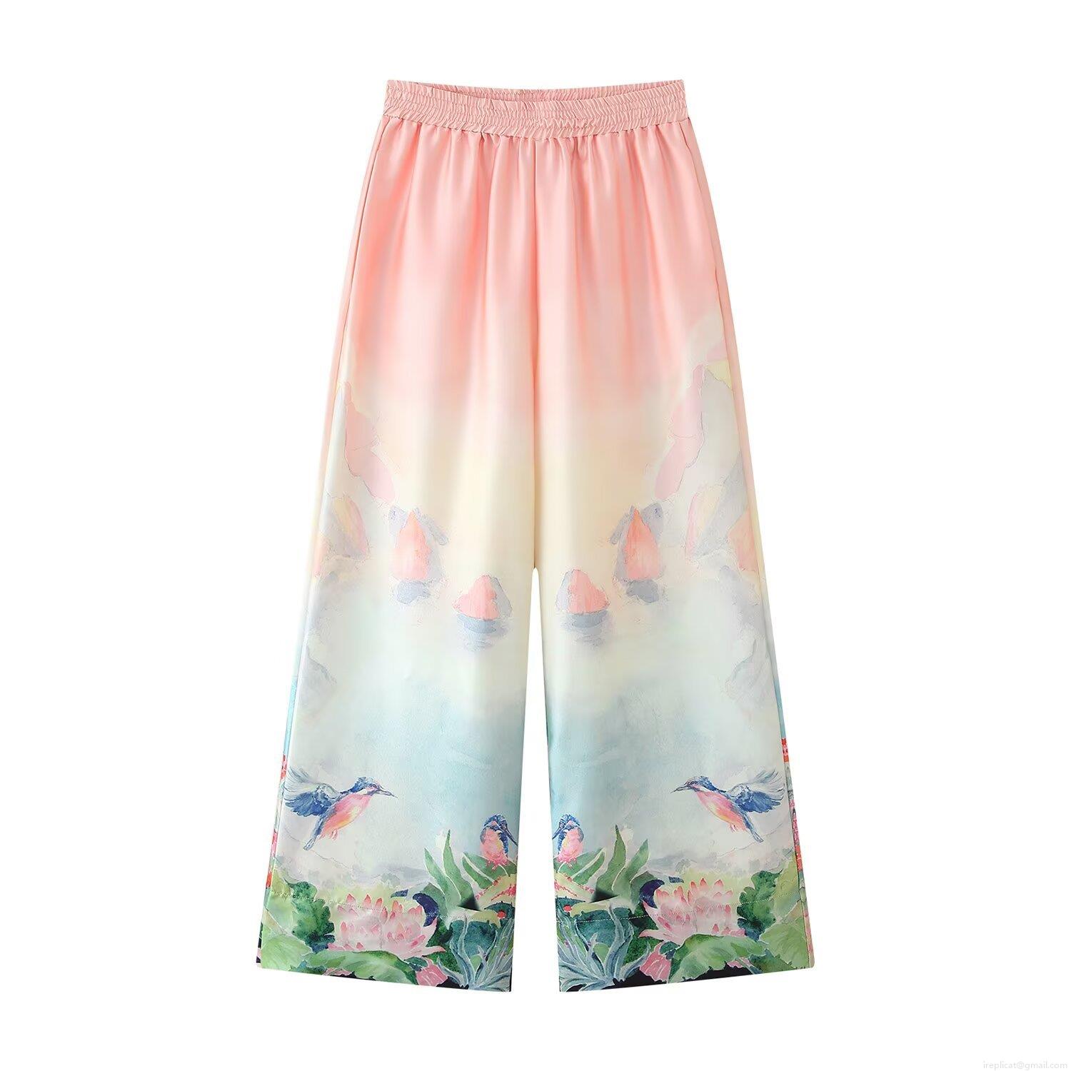 • Women's Satin Landscape Print Two Piece Set Long Sleeve Shirt and Wide Leg Pants Casual Fashion Oversized Streetwear Suit for Women