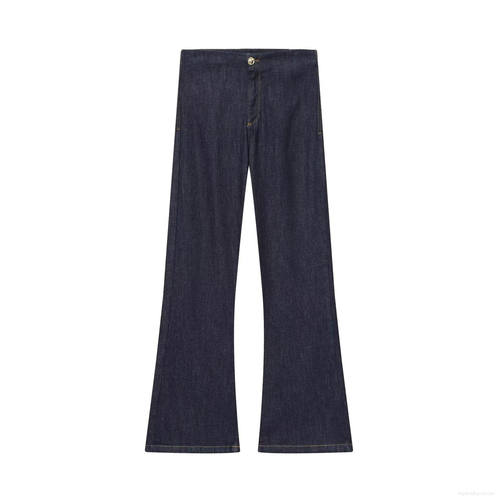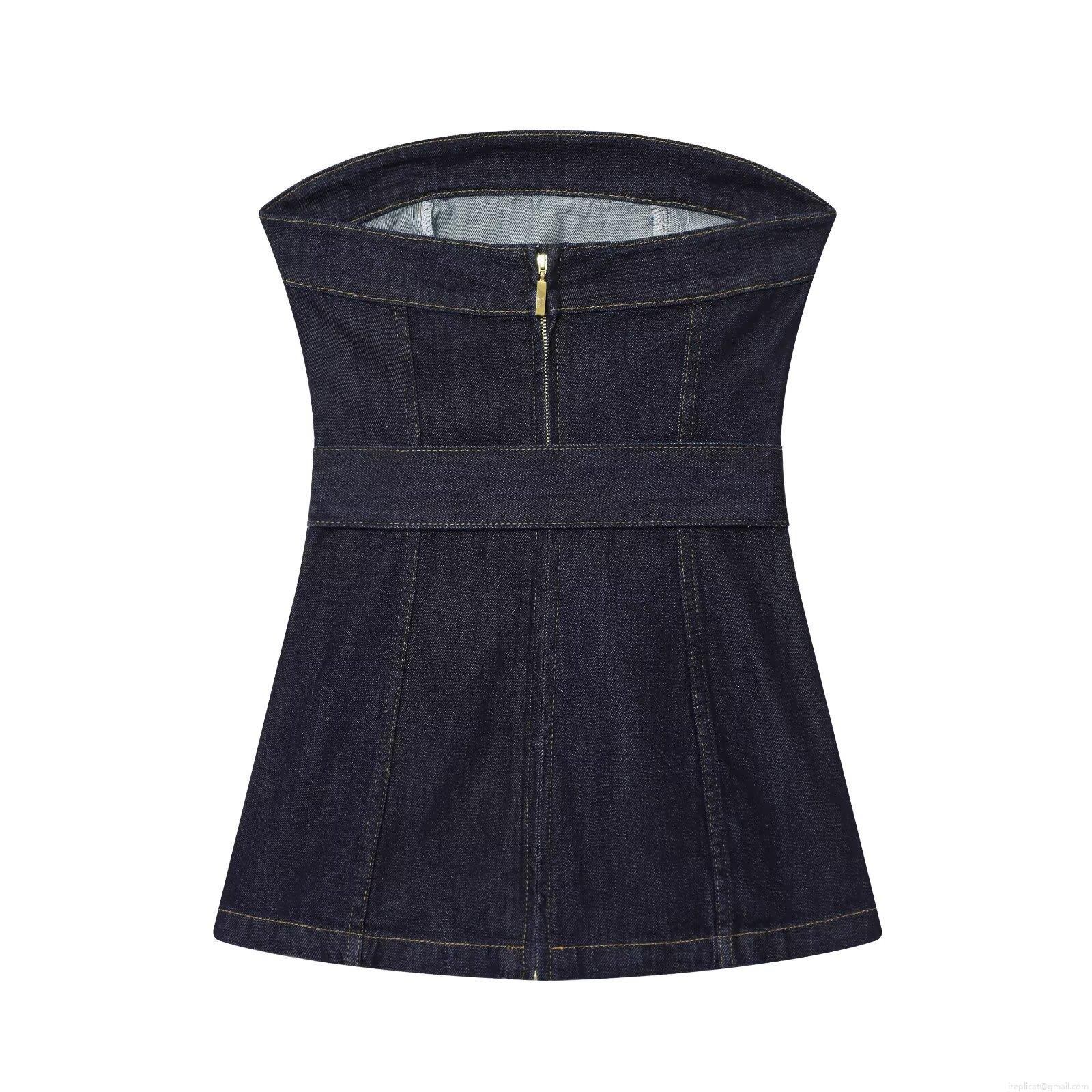• Women's Sexy Denim Two Piece Set Dark Blue Strapless Tube Top With Belt And High Waist Flare Jeans Contrast Stitching Street Casual Outfits