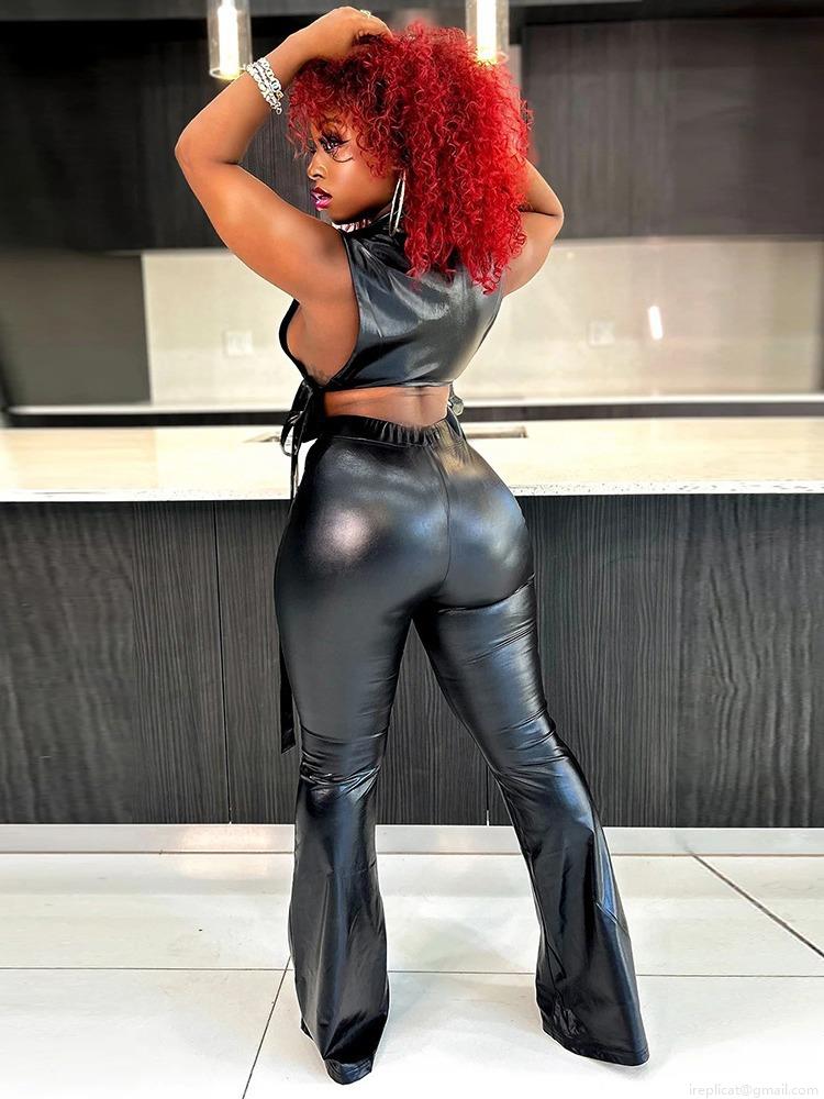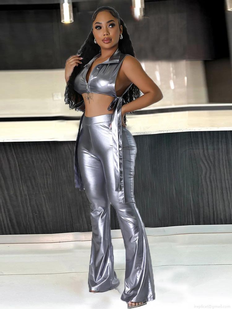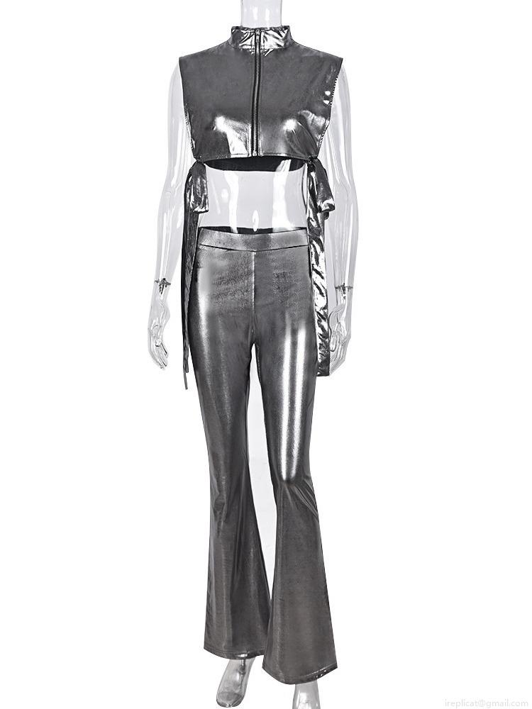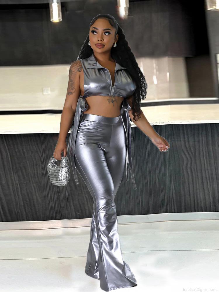 • Women's Sexy Metallic PU Leather 2 Piece Outfits Sleeveless Zip Up Hollow Out Crop Top And High Waisted Flare Pants Set Streetwear Clubwear Party Suit