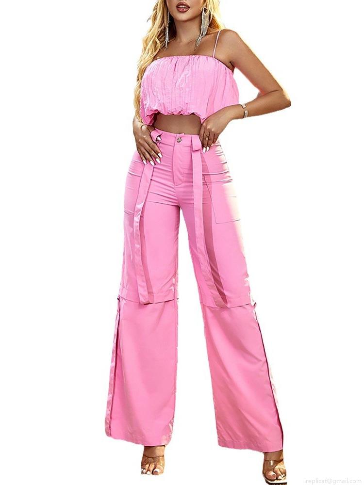 • Women's Sexy Pink Two Piece Pants Set Polyester Spandex Cropped Cami Top And High Waisted Wide Leg Trousers For Vacation Beach Party Trendy Summer Casual Outfit