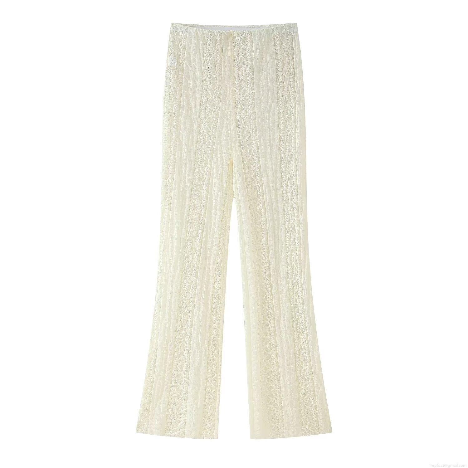 • Women's Sexy Polyester Lace Crochet Two-Piece Set Solid Color Cami Top and High Waist Flare Pants Set Streetwear Summer Outfits