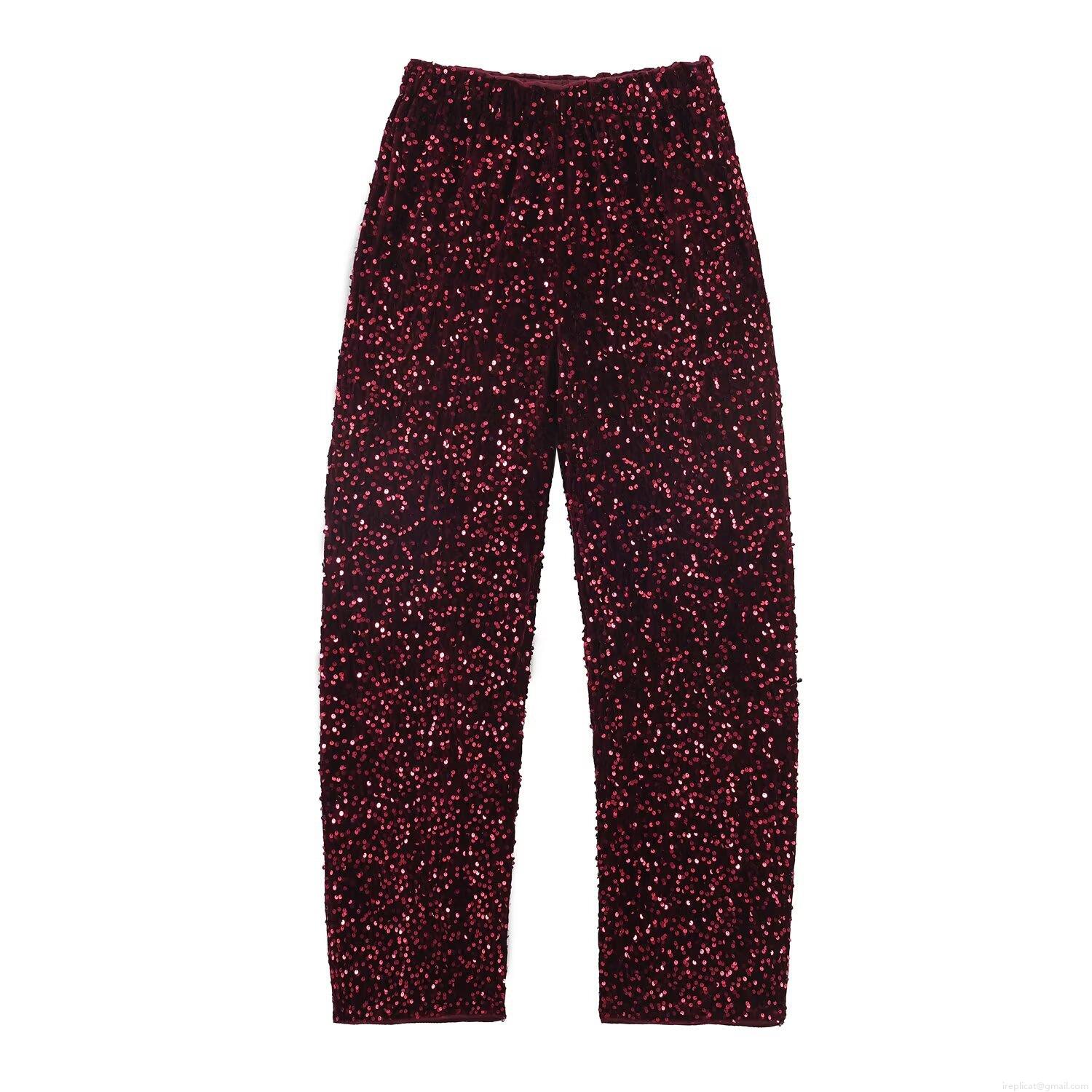 • Women's Sexy Wine Red Sequin Two Piece Set V Neck Sleeveless Top With Faux Fur Trim And High Waist Sequin Long Pants Party Club Outfits