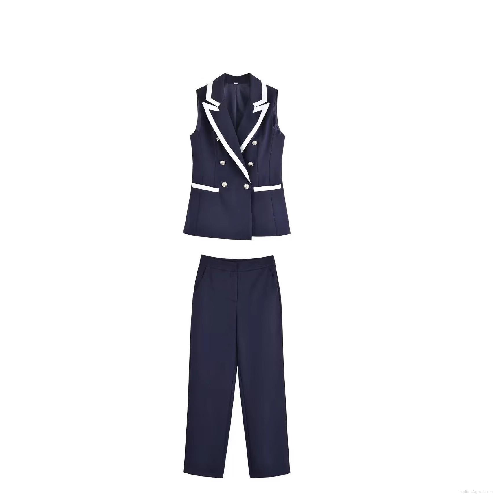 Women's Sleeveless Double Breasted Vest And Straight Leg Pants Two Piece Set Navy Blue Contrast Trim Suit For Office Street Wear