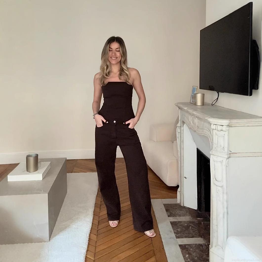 • Women's Street Style Brown Tube Top And High Waisted Wide Leg Pants Two Piece Set Off Shoulder Polyester Solid Color Casual Suit For Women