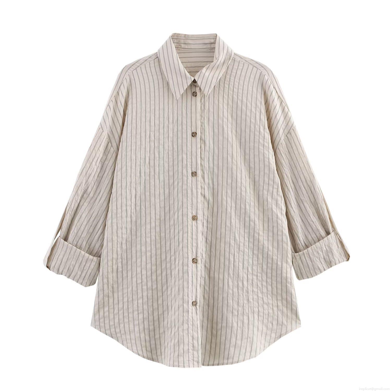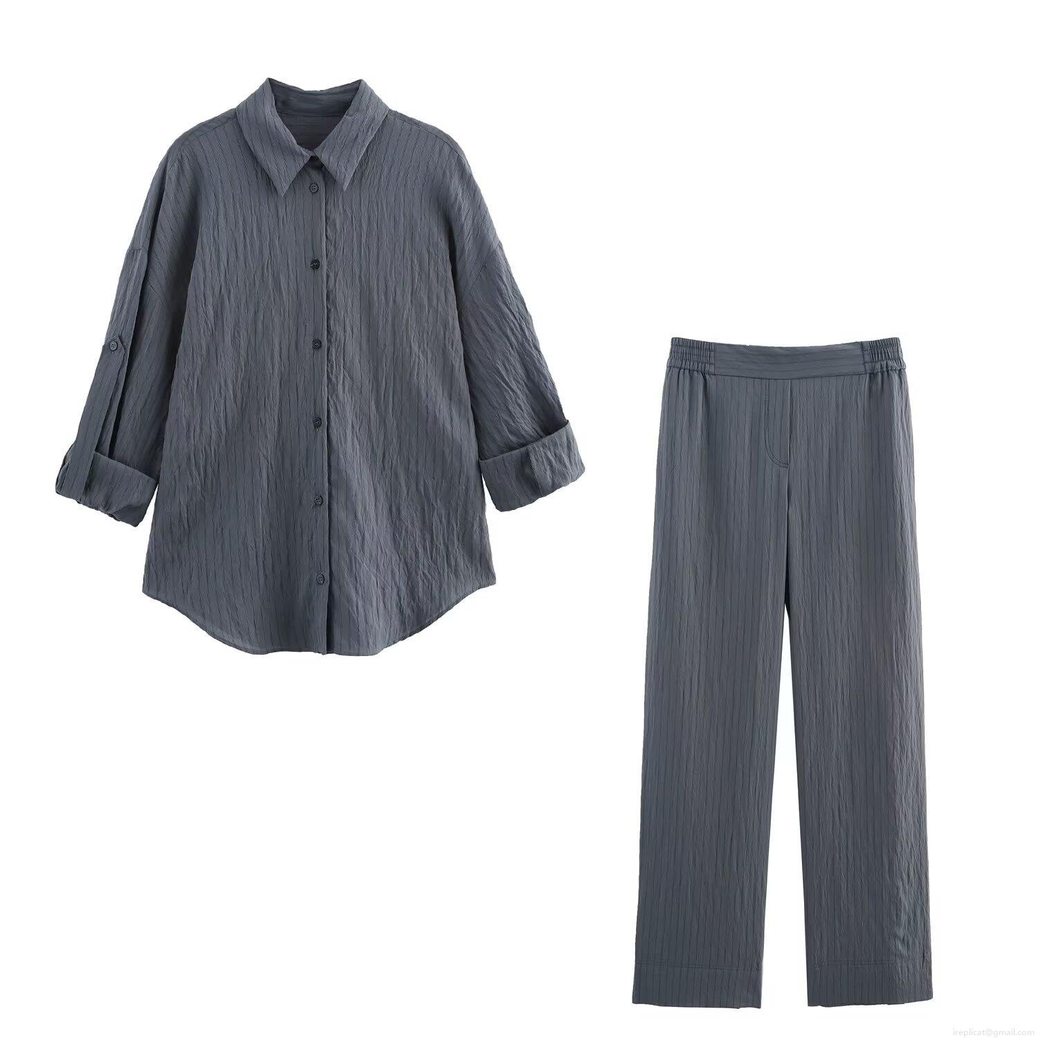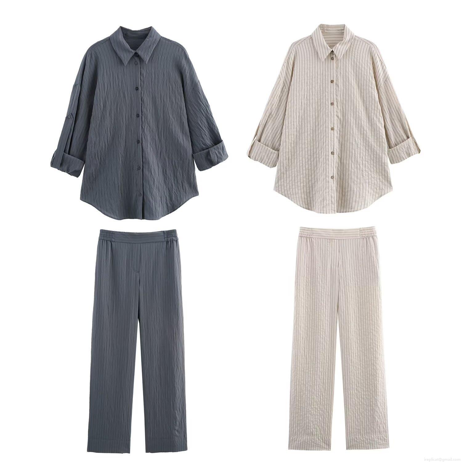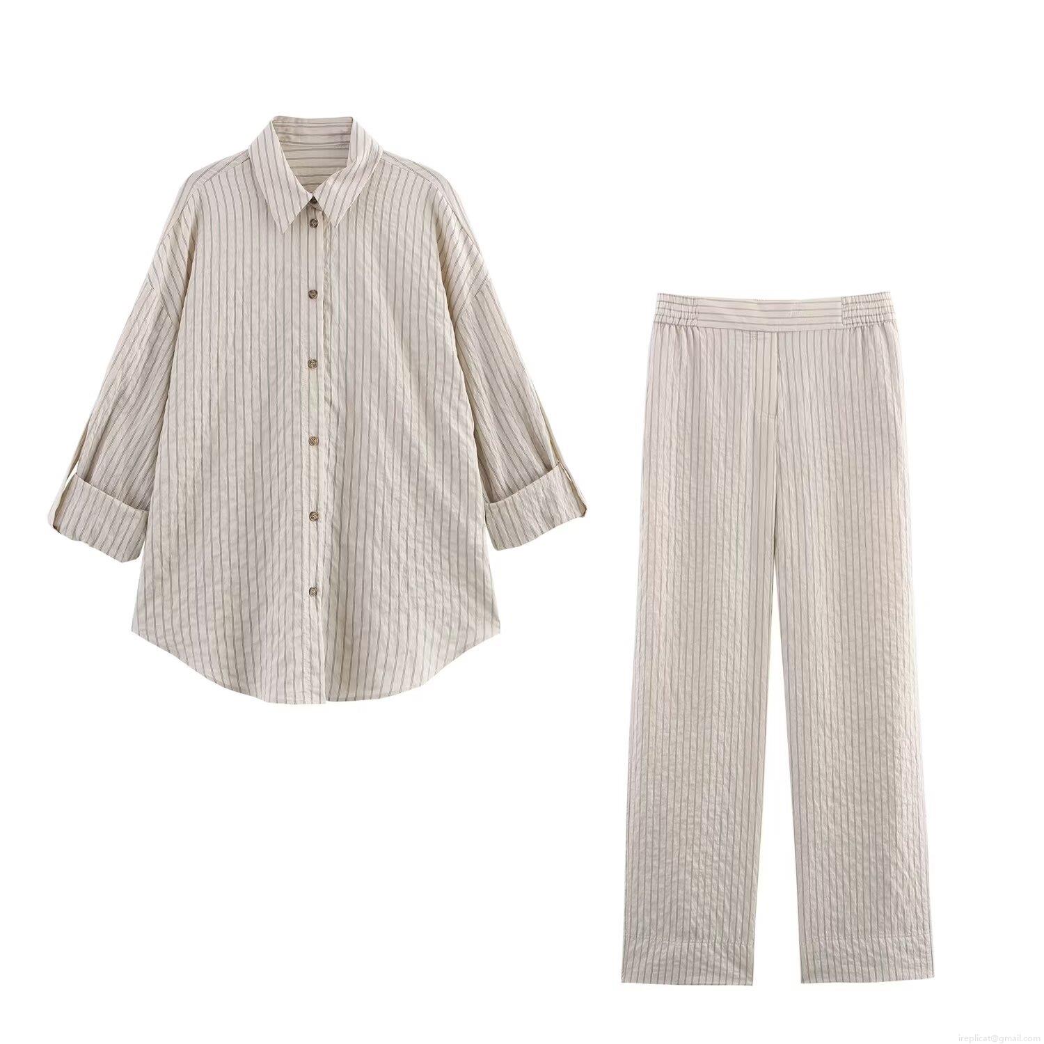 • Women's Striped Casual Two Piece Set Poplin Polyester Long Sleeve Lapel Button Up Shirt And Elastic High Waist Wide Leg Straight Pants Loungewear Co-ord Suit