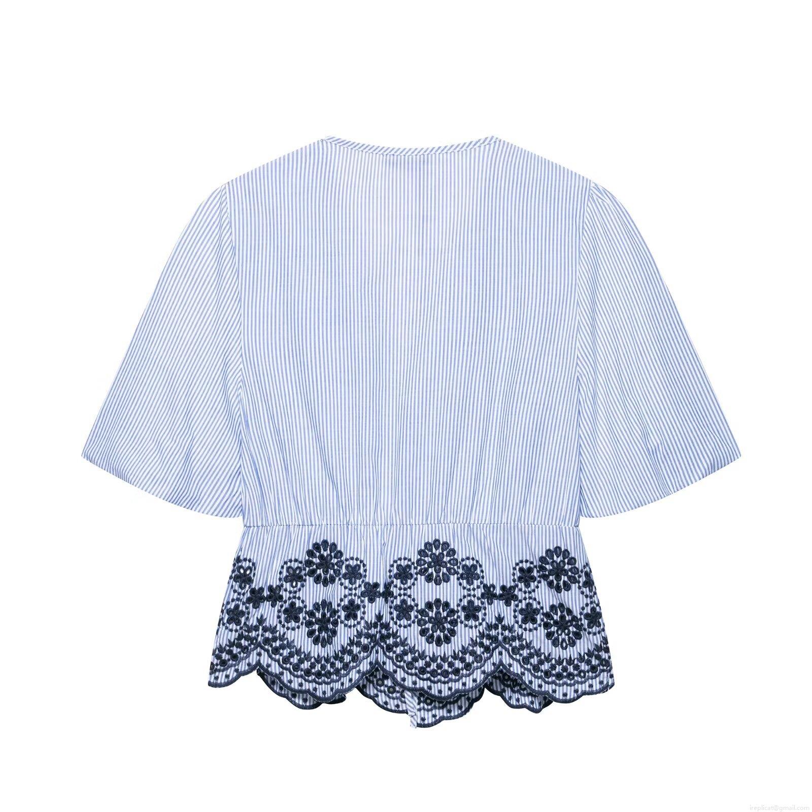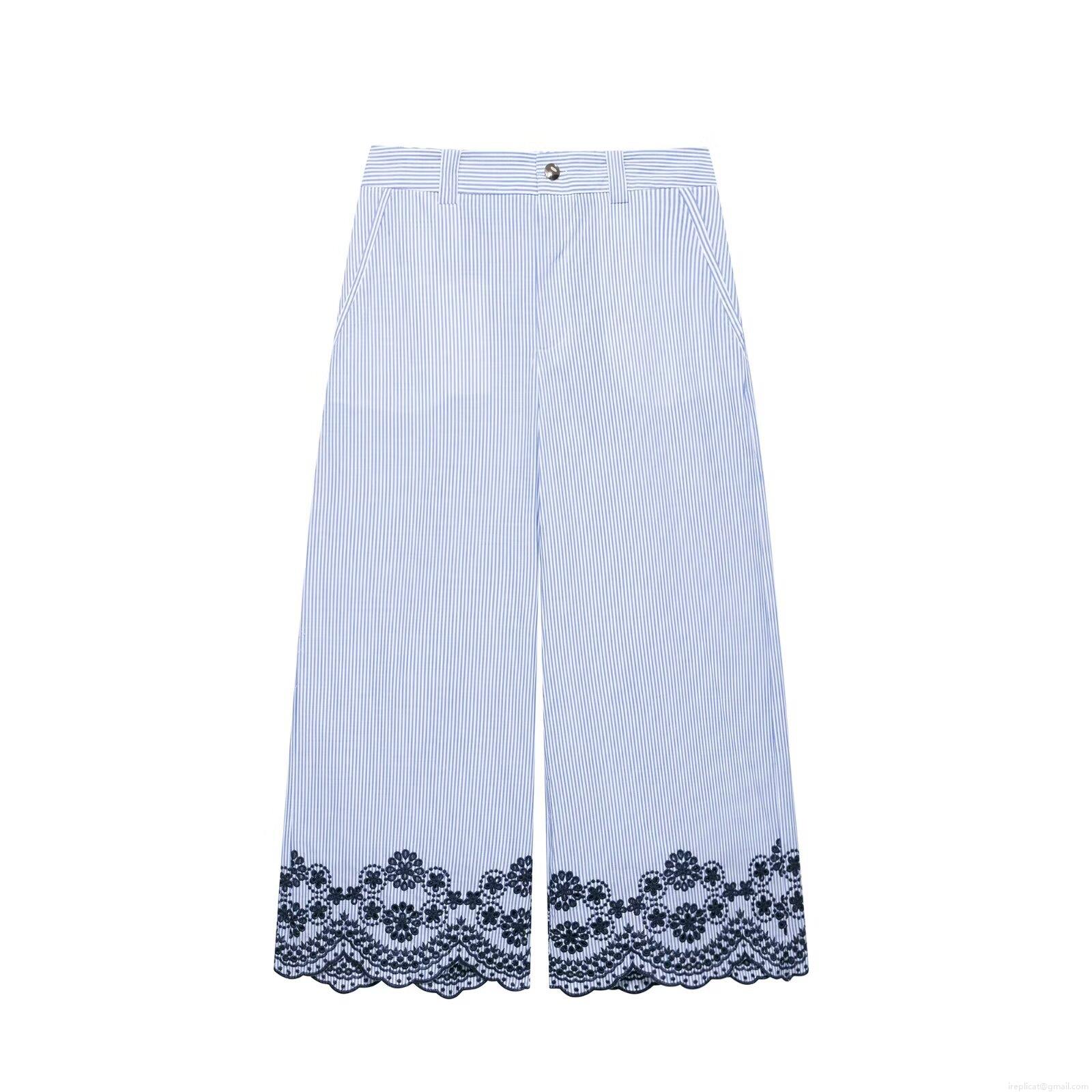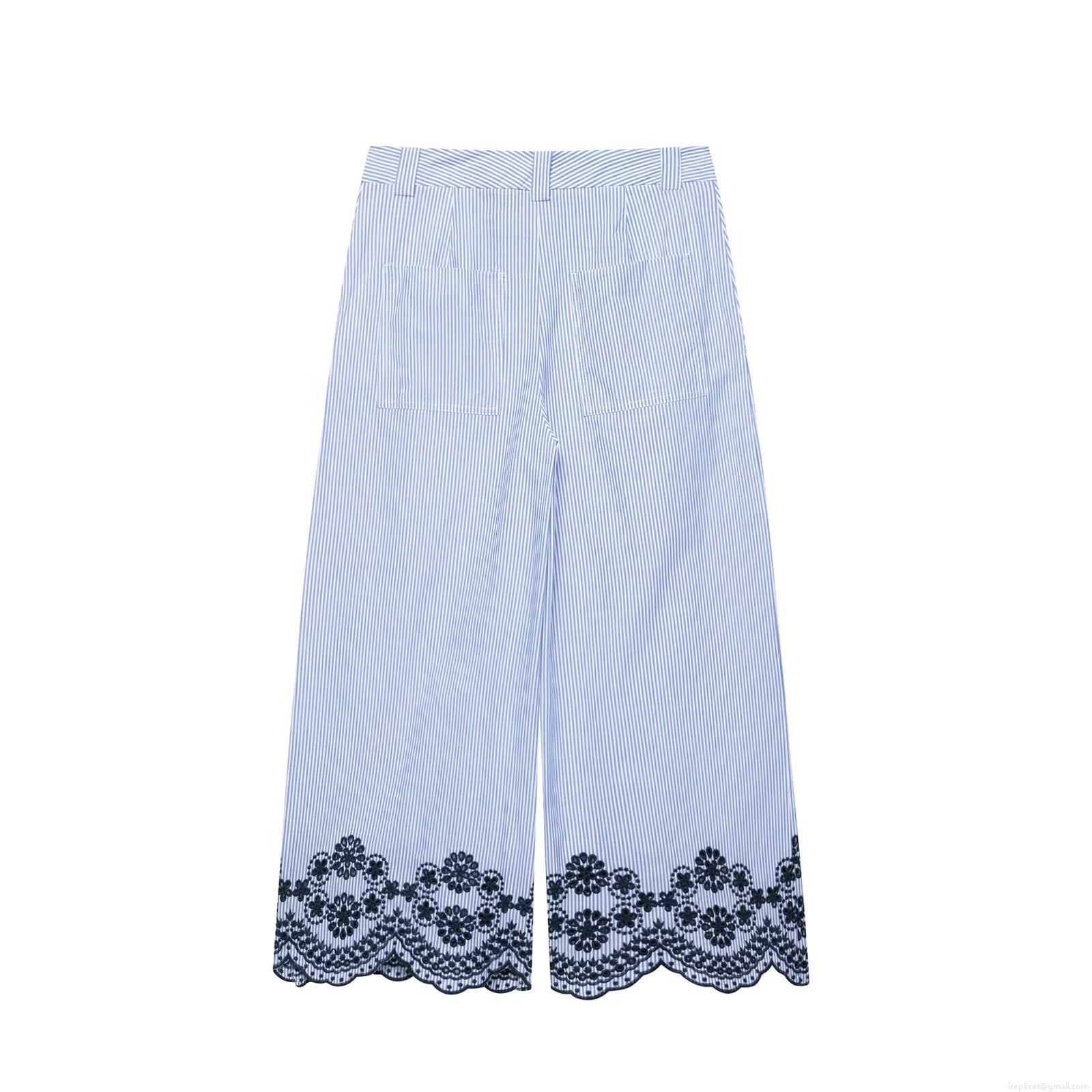 Stripe, Embroidery, Flowers, Puff Sleeves, Wide-leg, Ribbon Bow, Heavy Embroidery, Hollowed-out Wave Hem