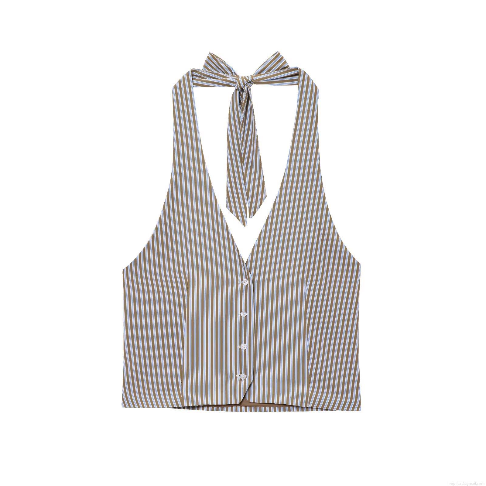 Vertical Stripes, Backless, Single-breasted, Color Blocking, Button Decoration, Neckband Design
