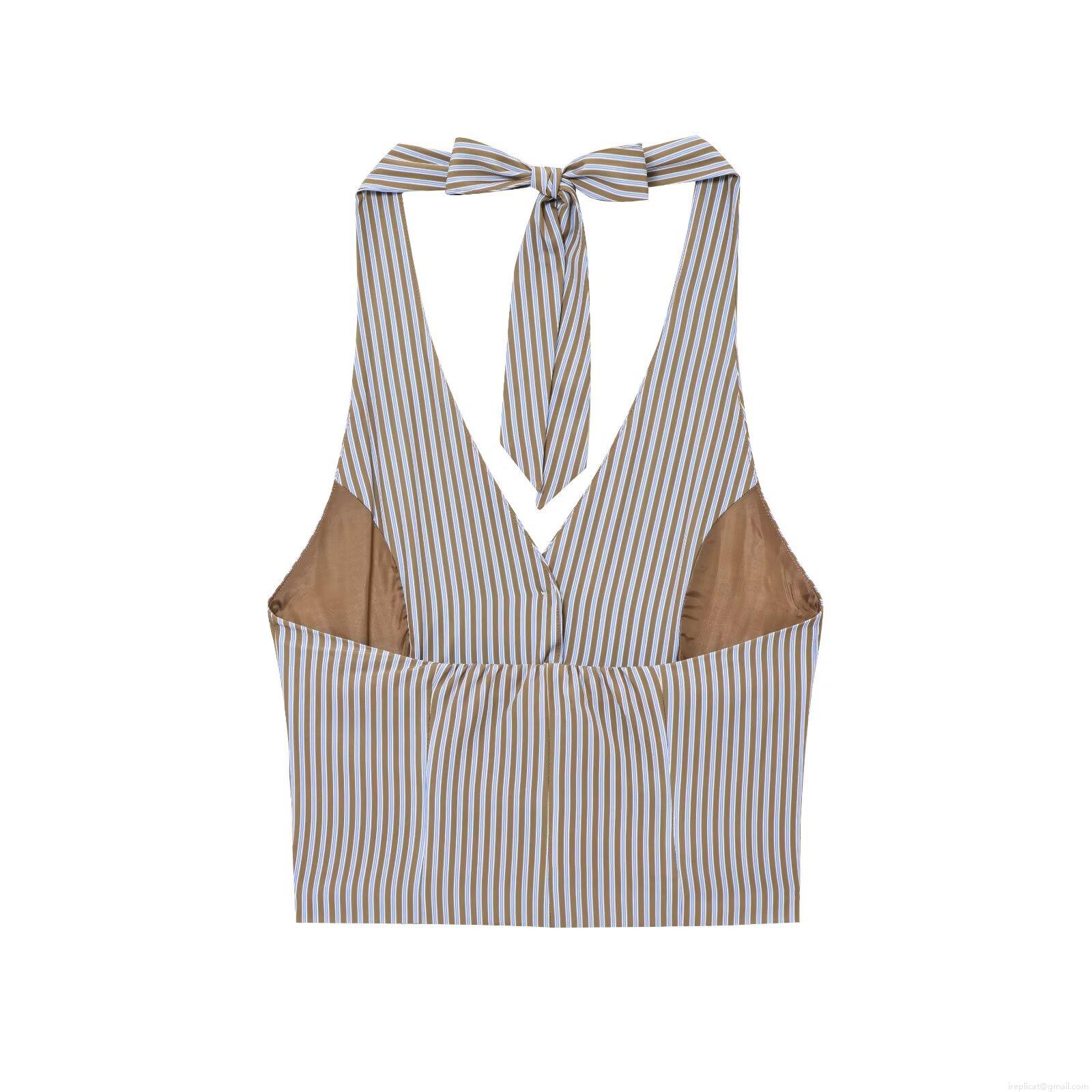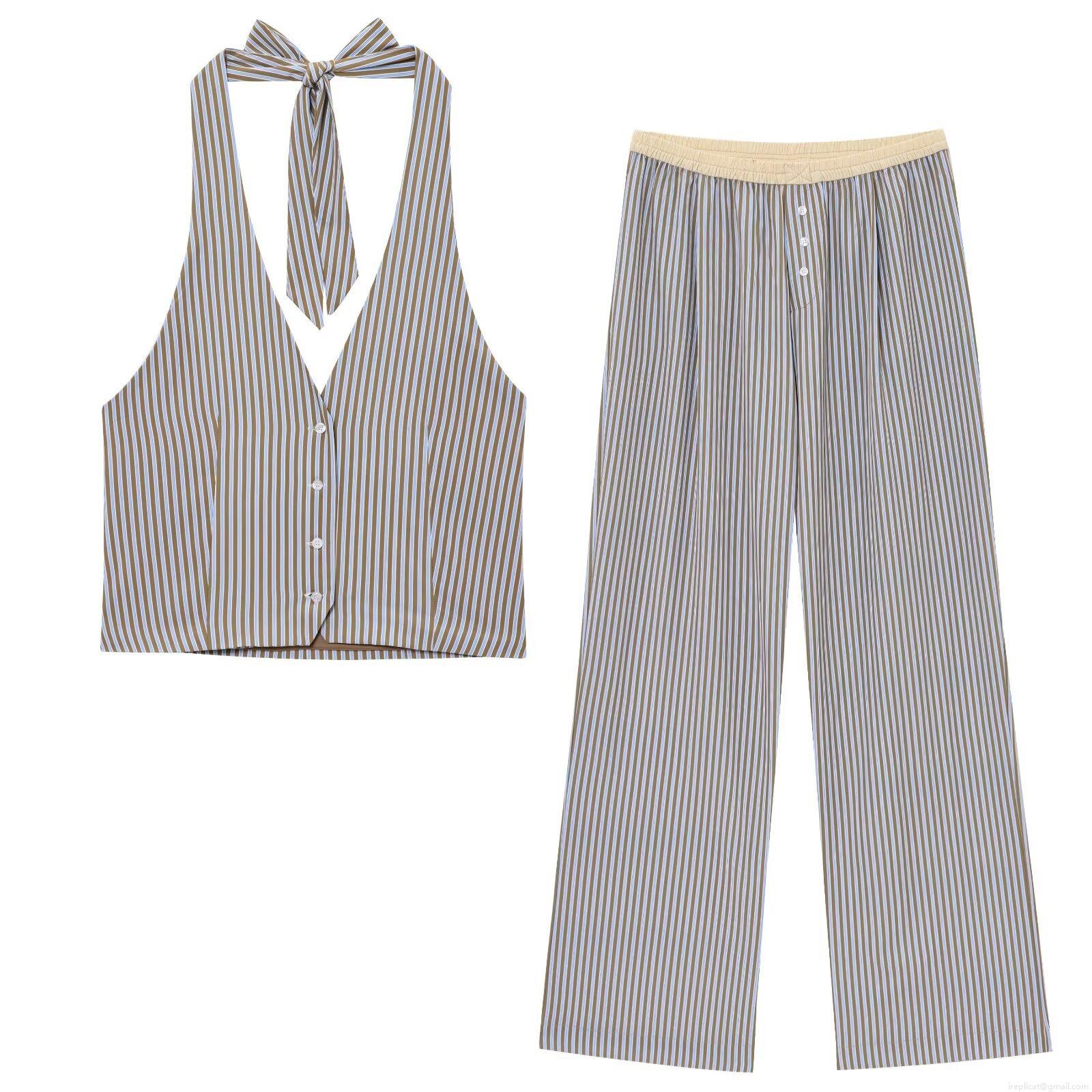 • Women's Striped Halter Neck Crop Top And Wide Leg Pants Set 2 Piece Summer Outfits Sexy Backless V Neck Button Down Vest Straight Trousers Casual Beach Vacation Polyester Cotton Blend Clothing