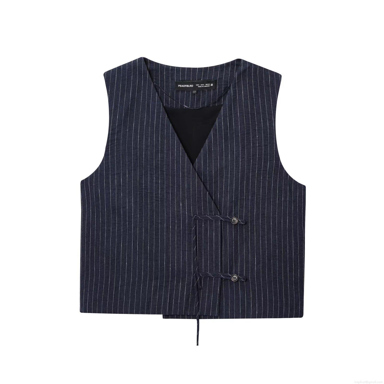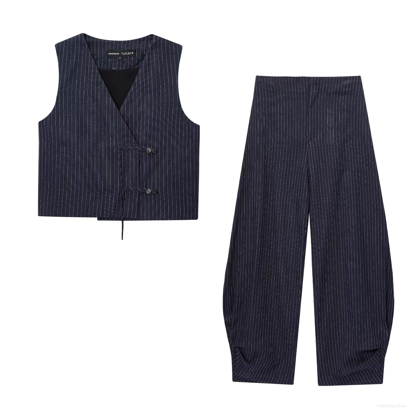 • Women's Striped Linen Blend 2 Piece Set Sleeveless Side Button Vest Waistcoat And High Waisted Wide Leg Balloon Pants Streetwear Outfits