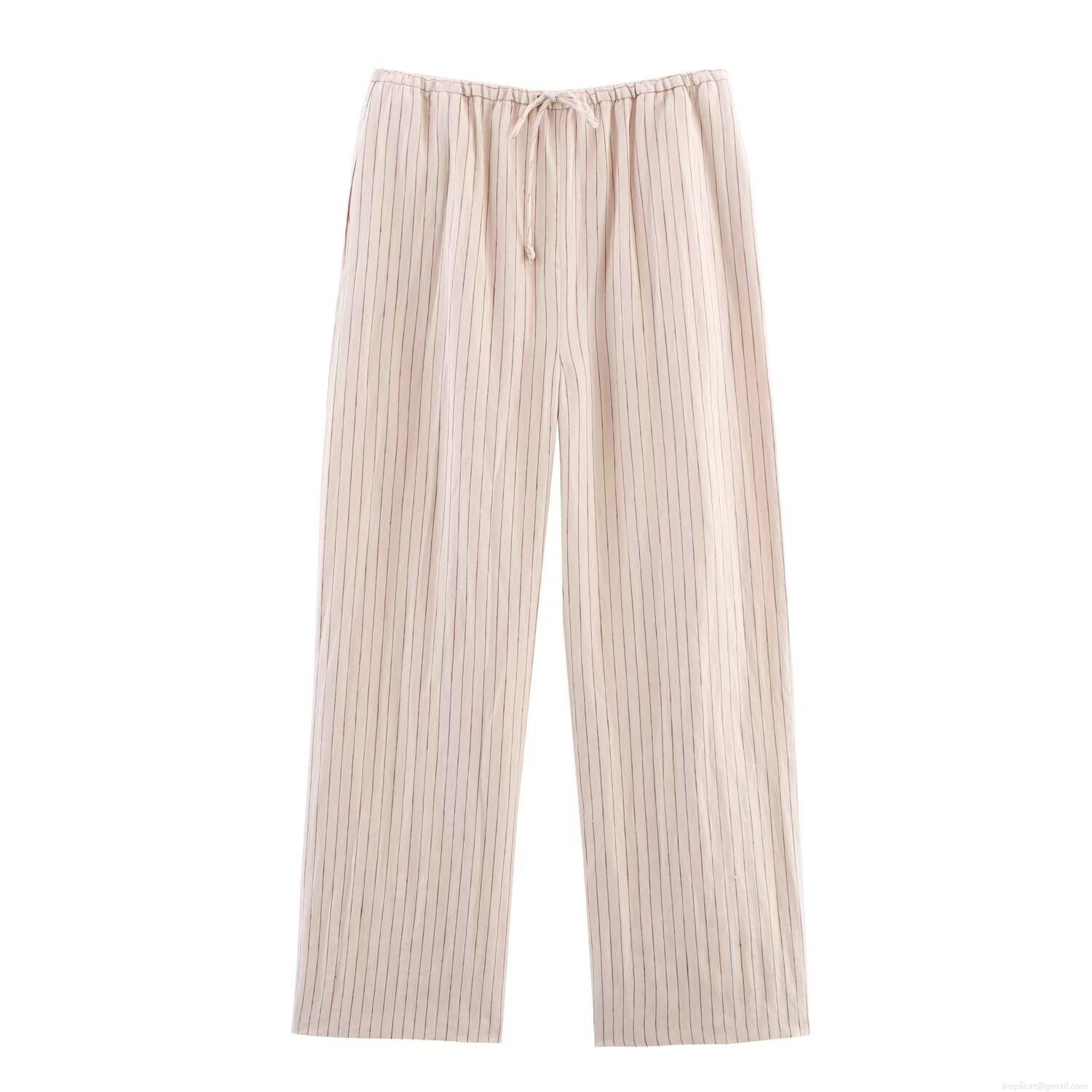 • Women's Striped Linen Blend Two Piece Set Casual Long Sleeve Button Down Shirt And Drawstring Straight Leg Pants Outfits Streetwear