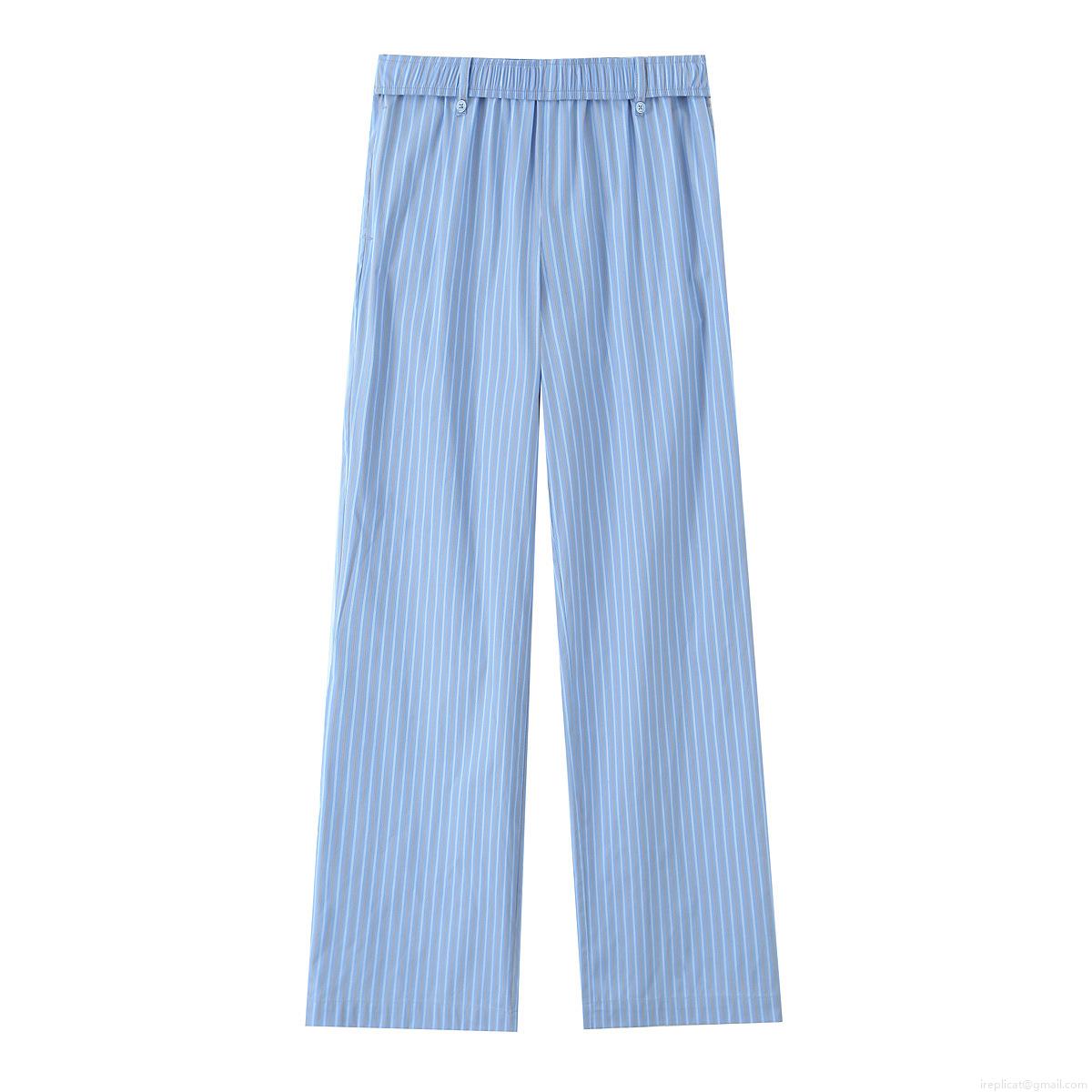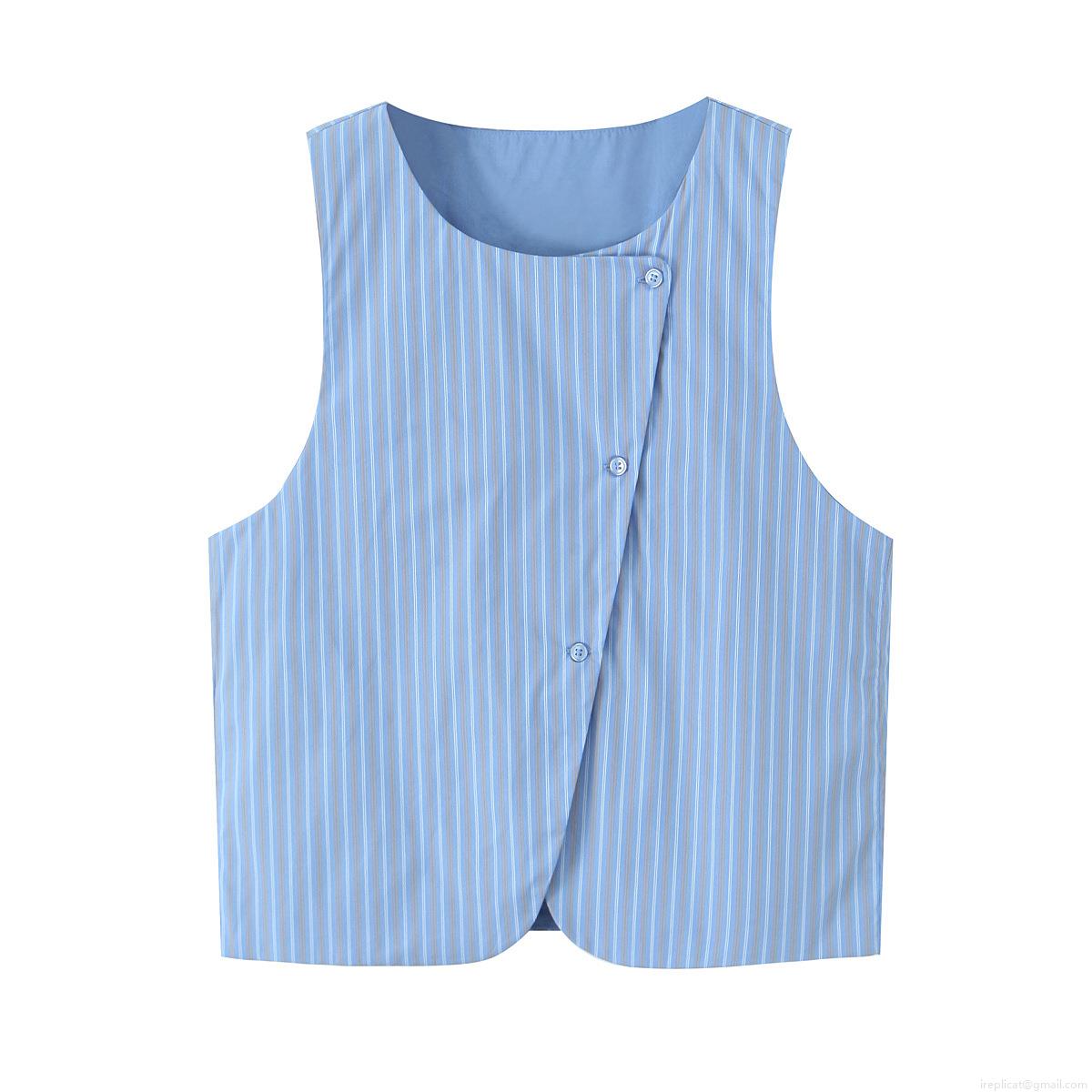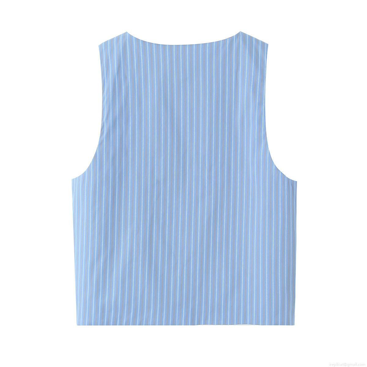 • Women's Striped Sleeveless Vest Top And Straight Leg Pants Casual Two Piece Set Elegant V-Neck Side Button Summer Outfit Light Blue White Stripes