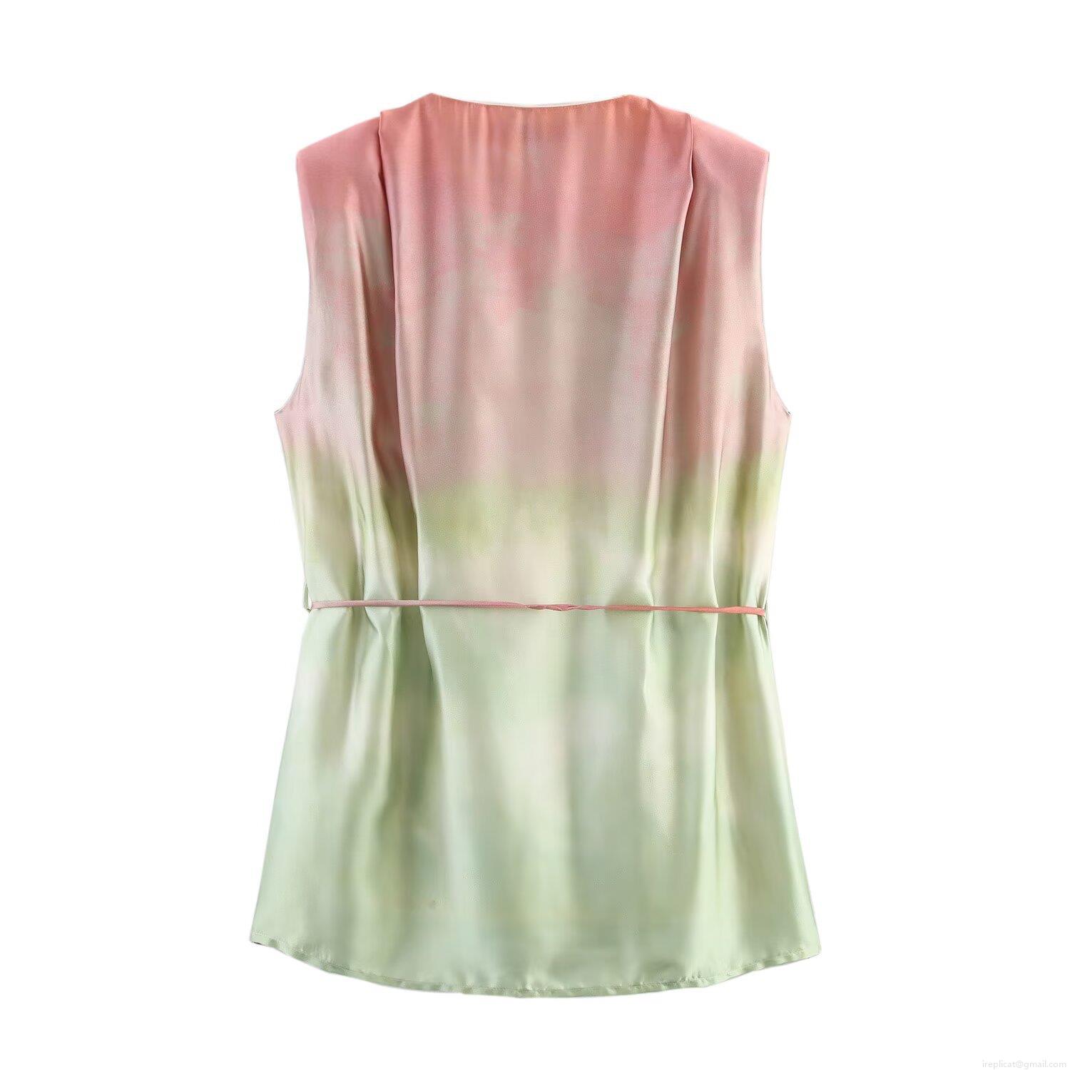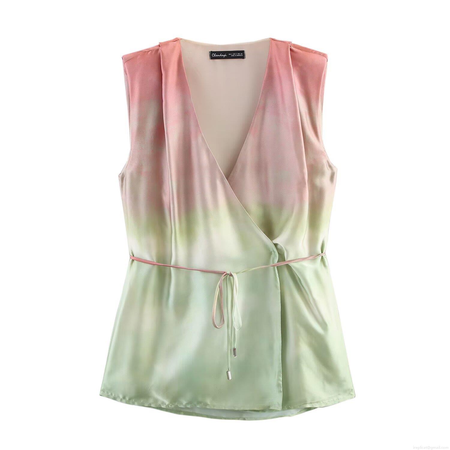• Women's Summer 2 Piece Satin Outfits Sleeveless V Neck Wrap Tie Front Top and High Waisted Wide Leg Pants Set Gradient Tie Dye Chic Casual Streetwear Outfits for Vacation Clubwear