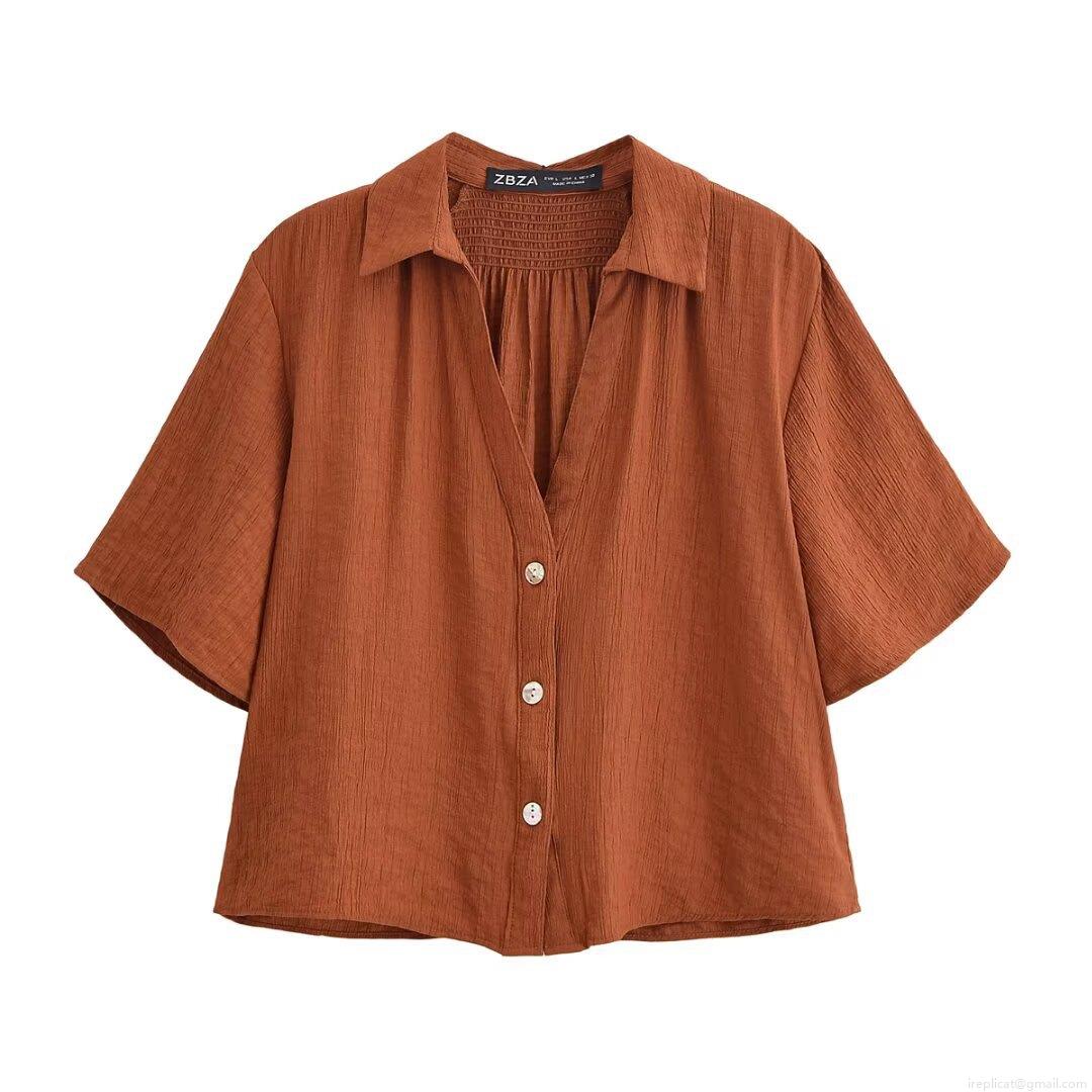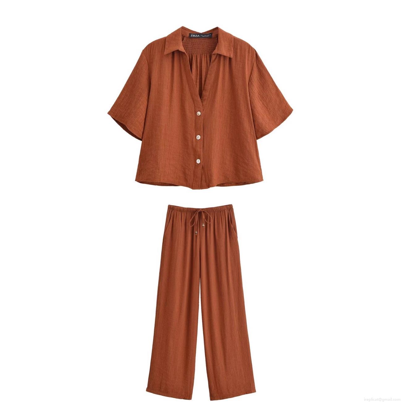 • Women's Summer 2 Piece Set Casual V Neck Short Sleeve Button Down Shirt And High Waist Wide Leg Drawstring Pants Wrinkle Textured Vacation Outfits