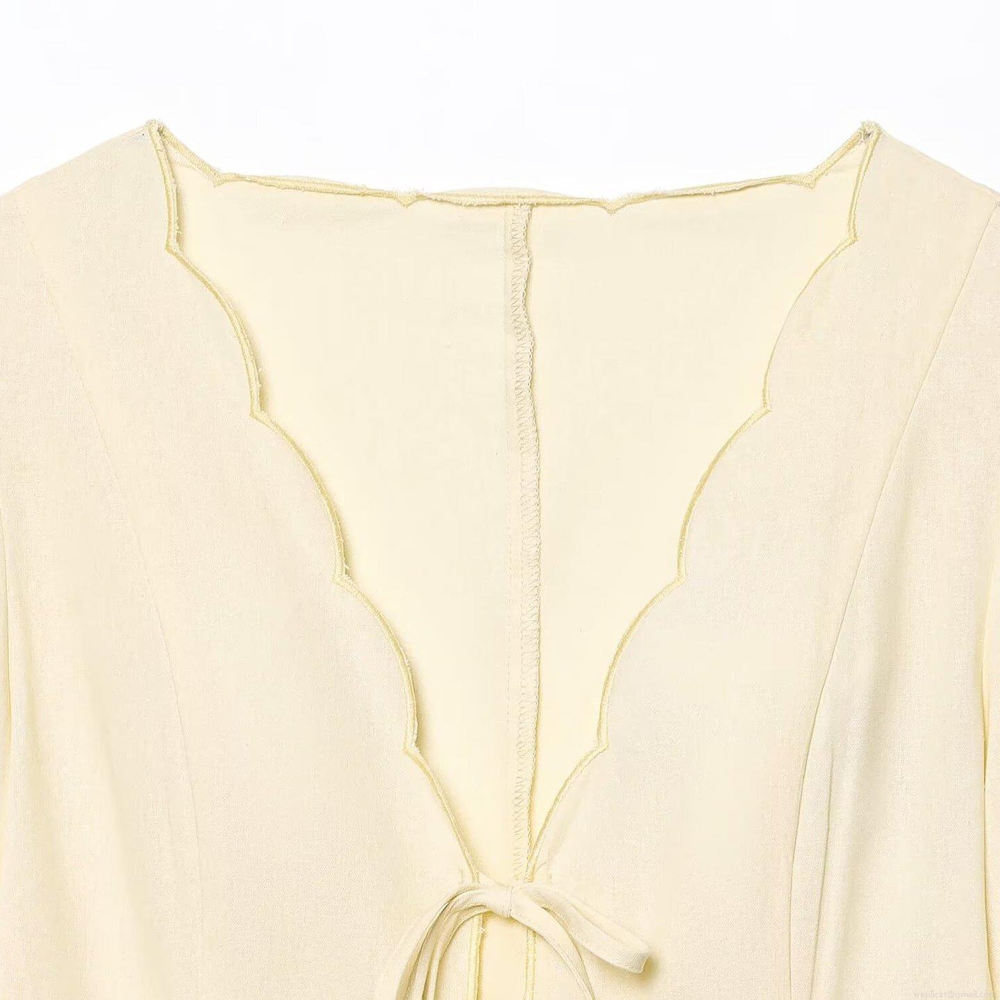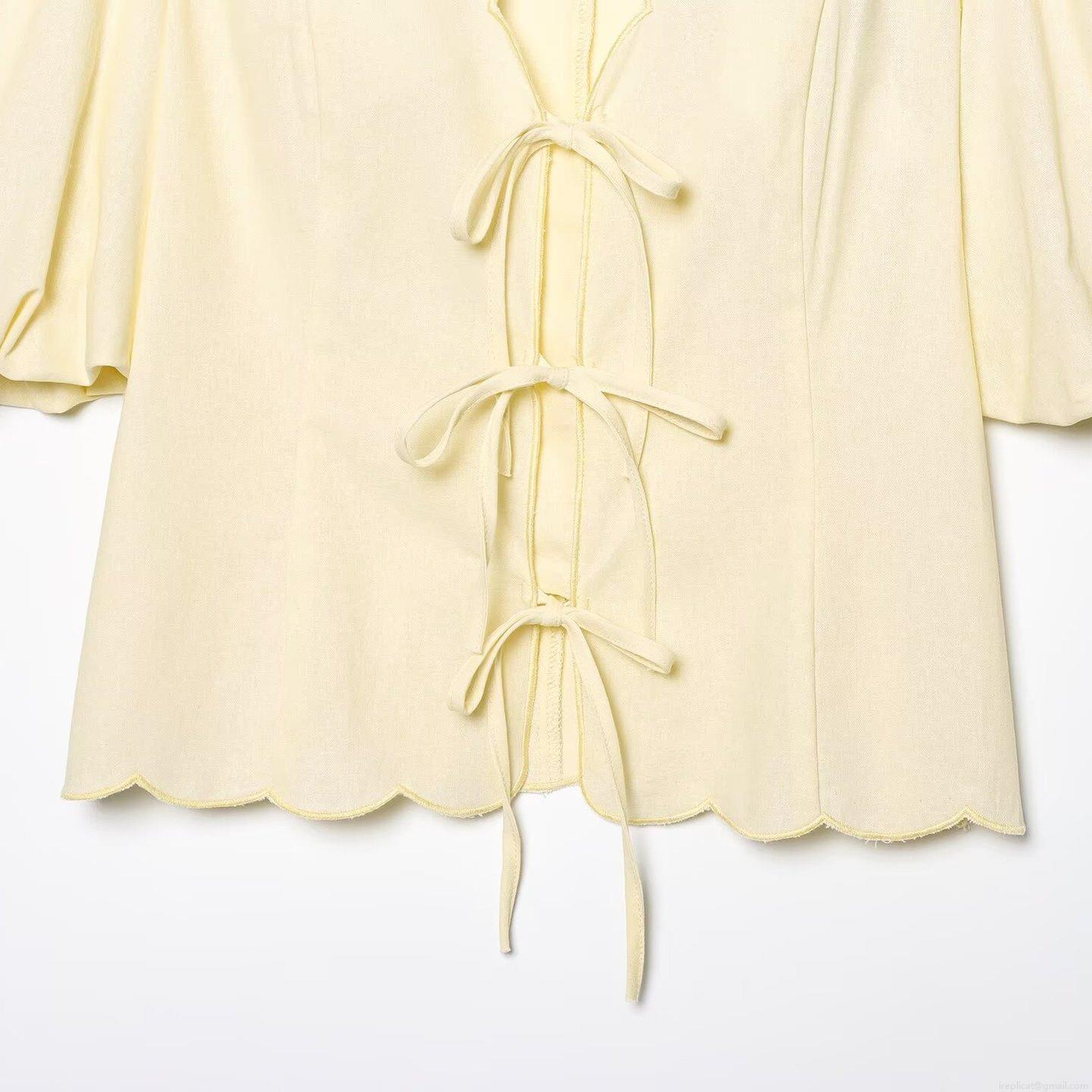• Women's Summer 2-Piece Outfit Set Scalloped V-Neck Tie Front Short Puff Sleeve Blouse Top And High Waist Wide Leg Long Pants Solid Color Sweet Casual Streetwear Suits