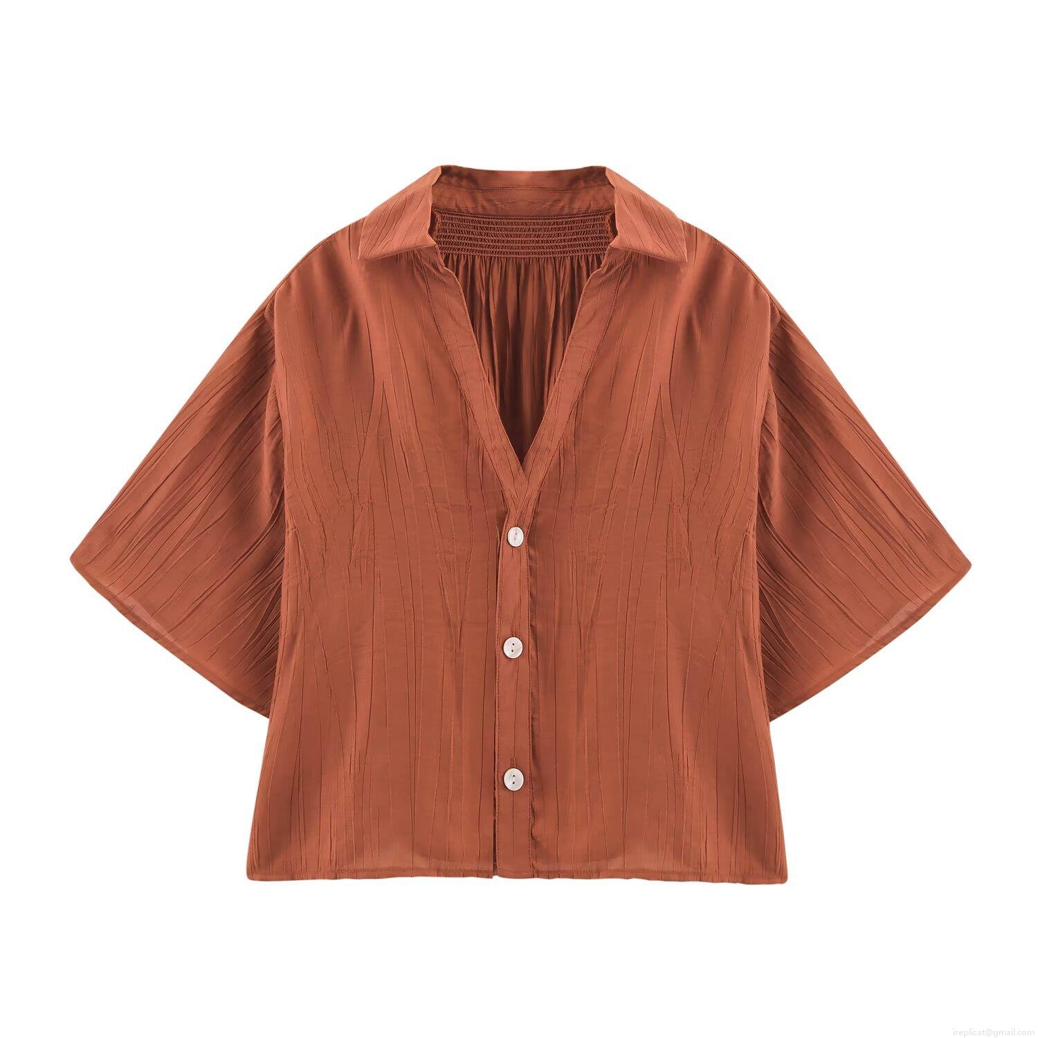 • Women's Summer Casual 2 Piece Outfits Short Sleeve V Neck Button Down Shirt And High Waist Wide Leg Pants Set With Wood Beads Crinkled Texture Loose Streetwear