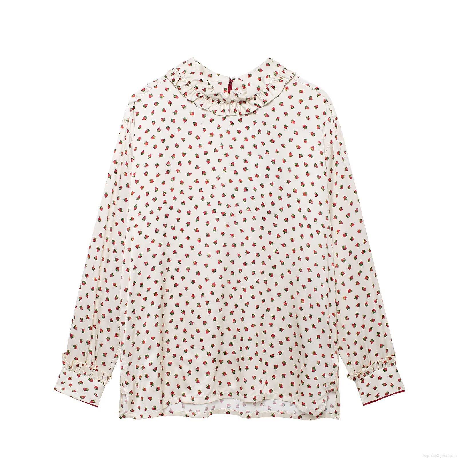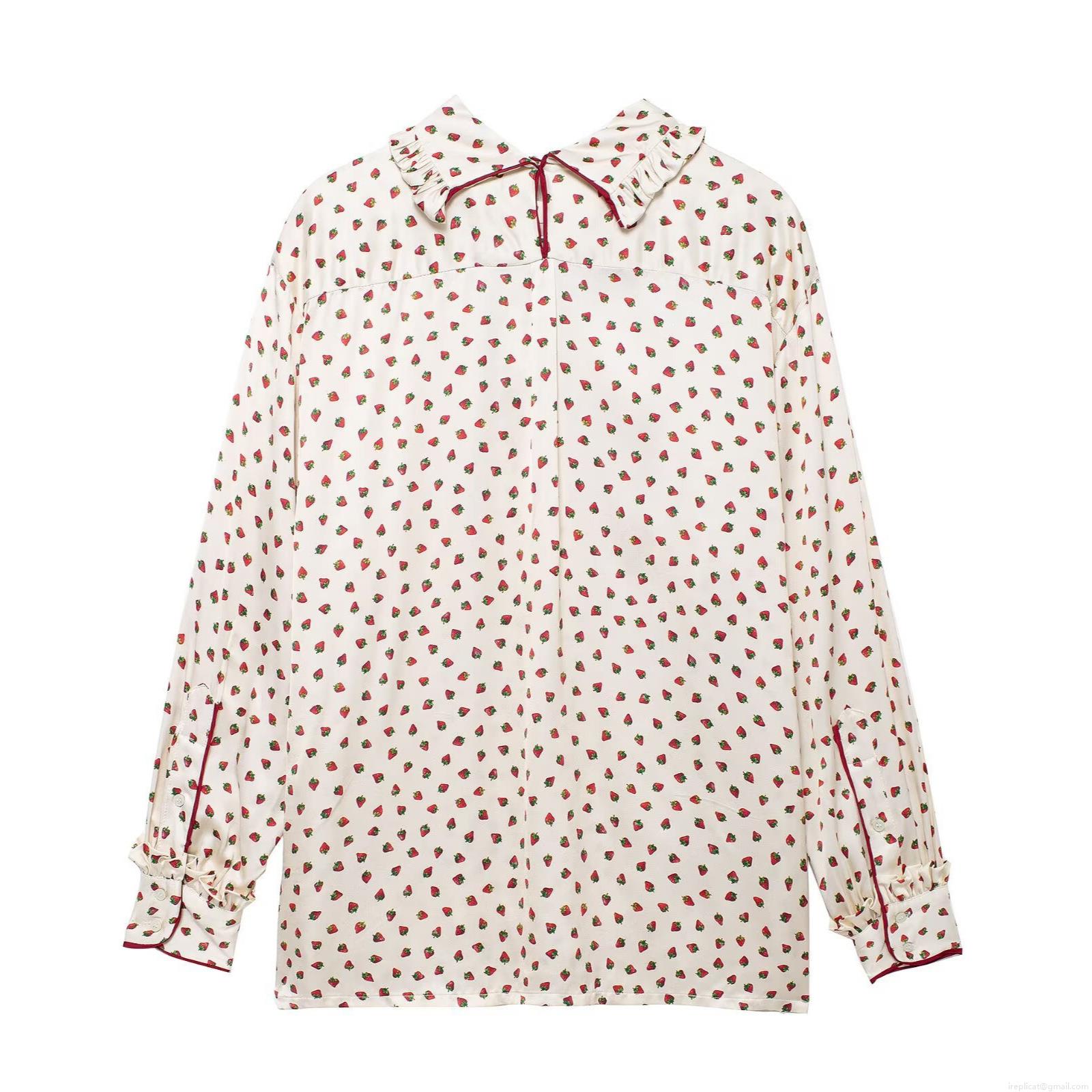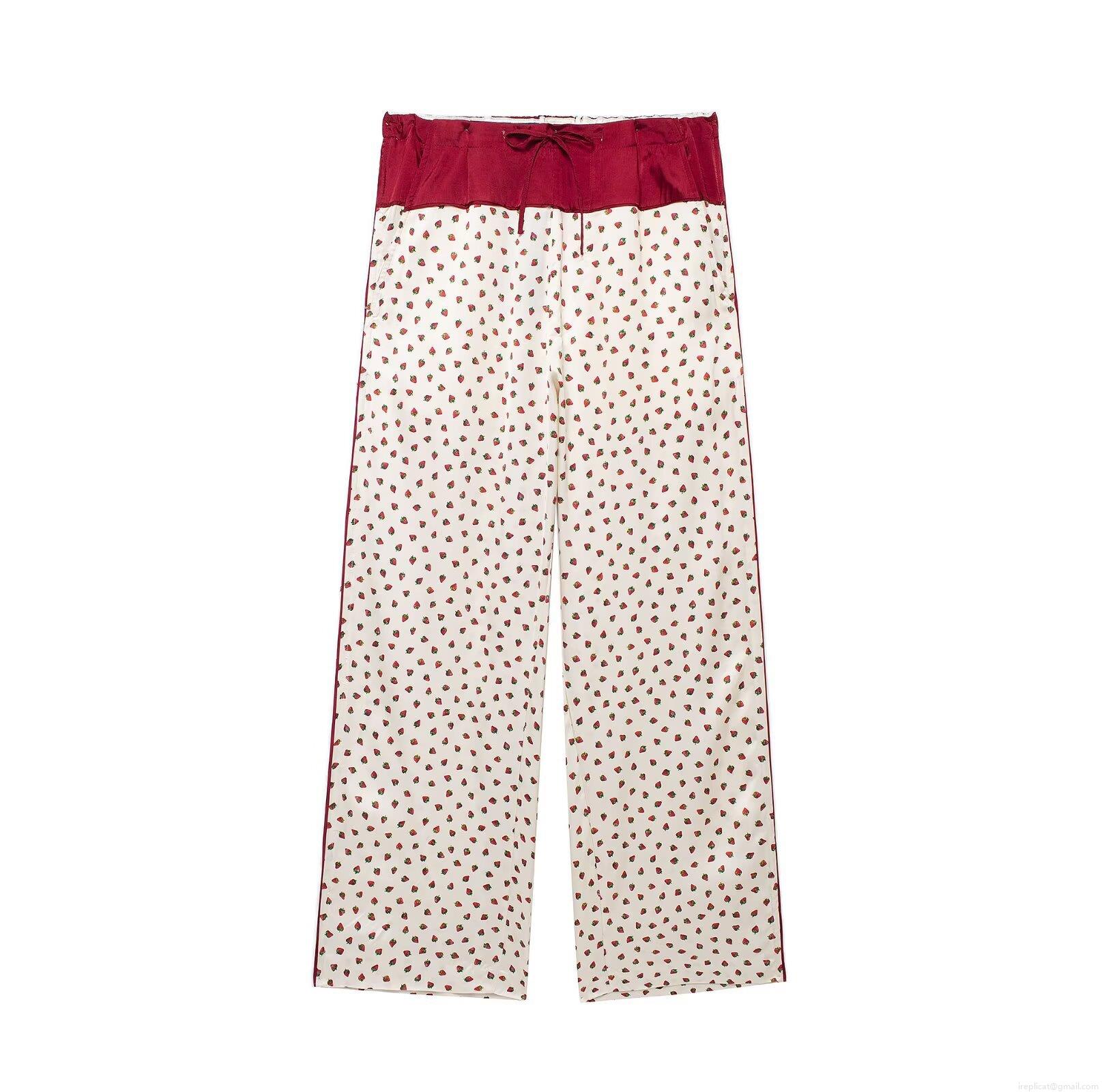 • Women's Sweet Strawberry Print Long Sleeve Shirt Ruffle Stand Collar Top and Wide Leg Tie Waist Pants Two Piece Casual Loungewear Set Polyester Woven Outfit