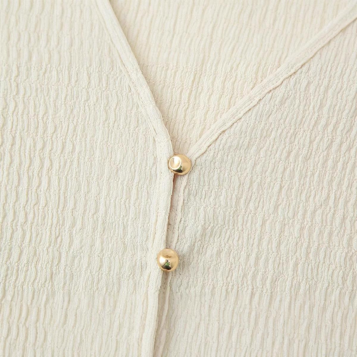Solid Color, Gold Round Buckle, V-neck, Bell Sleeves, Pleated Texture, Wide-leg Design