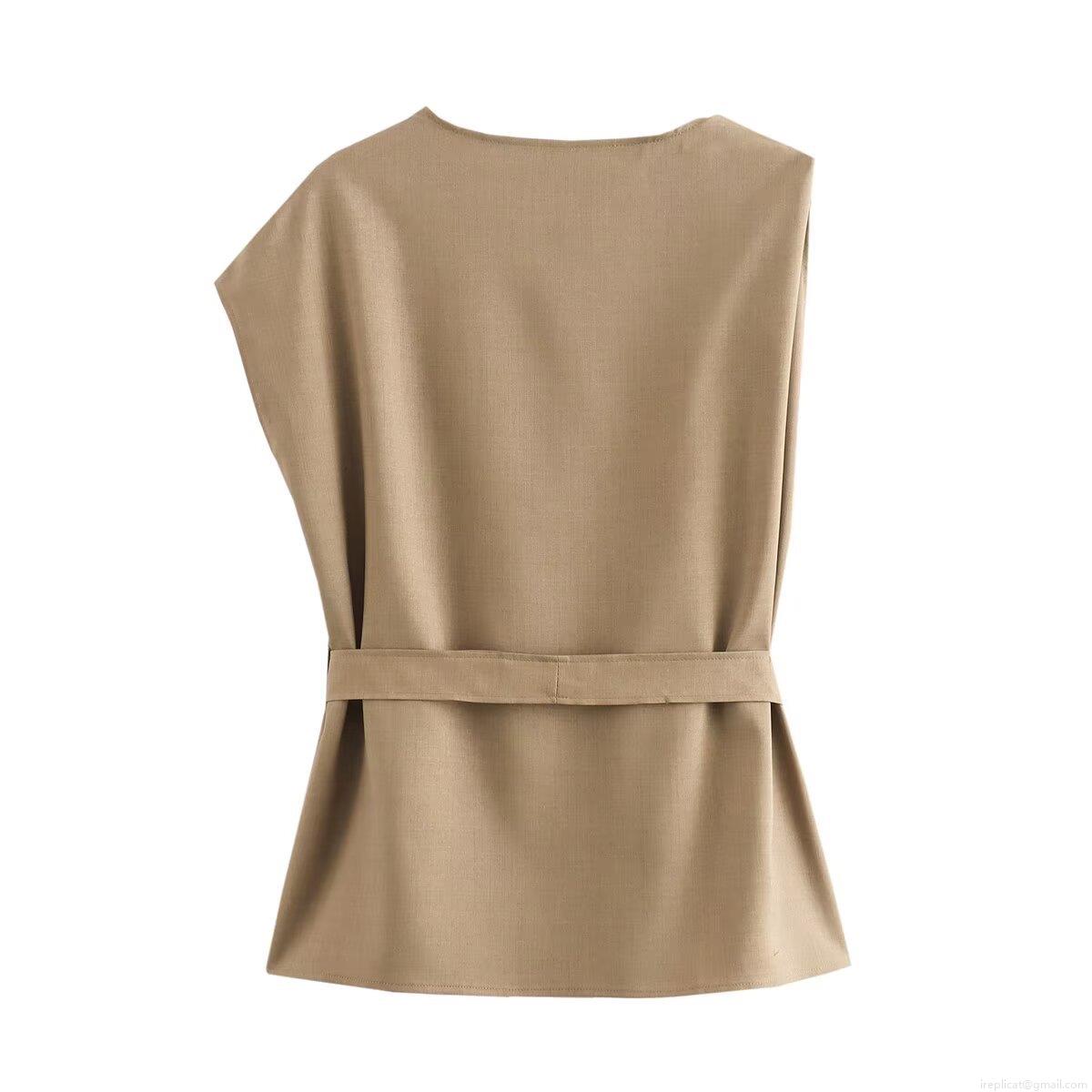 Women's Two Piece Casual Set Woven 100% Polyester Sleeveless Round Neck Belted Top and Wide Leg Pants Khaki Solid Streetwear Summer Outfit For Women