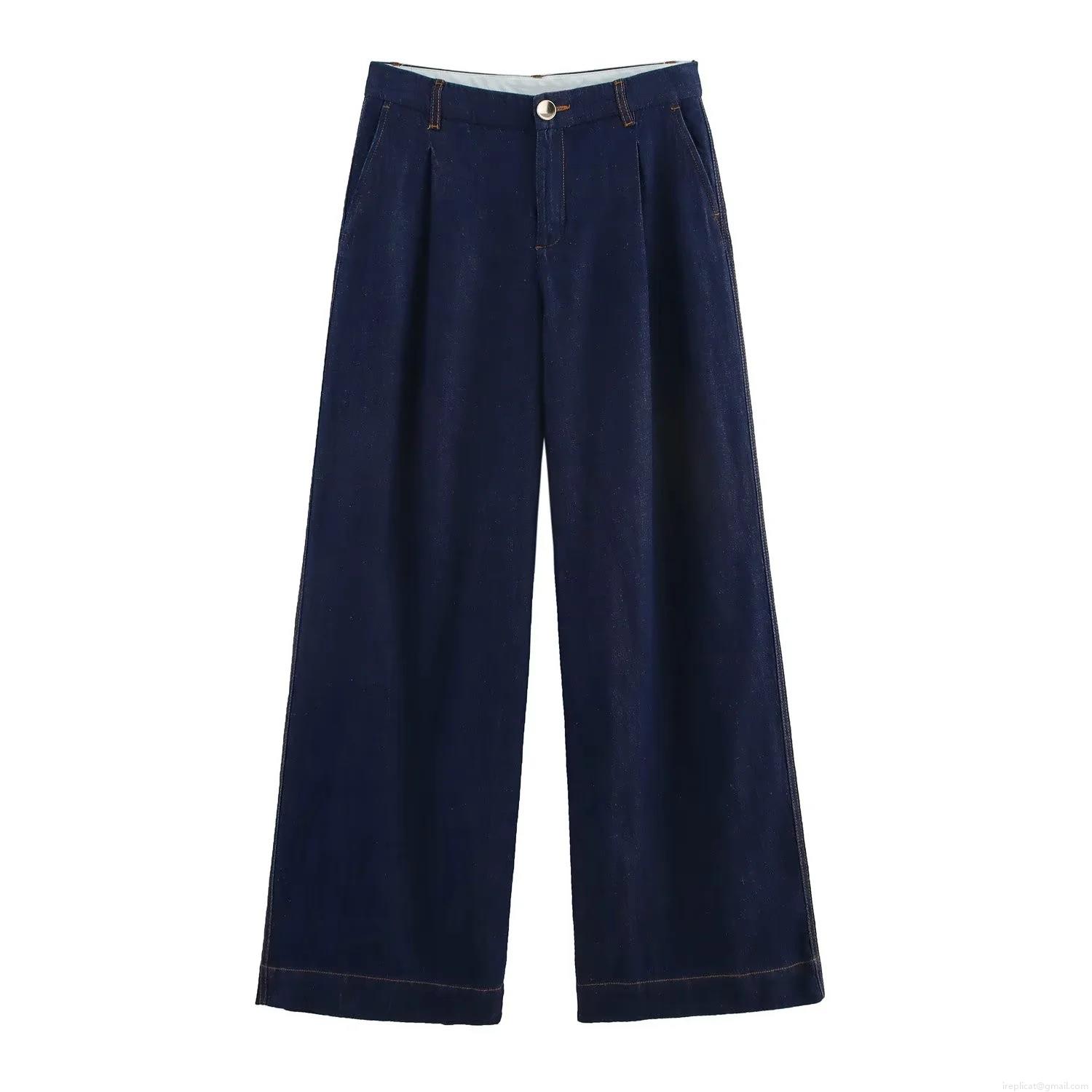 Women's Two Piece Denim Set Casual Wide Sleeve Button Up Shirt and High Waist Wide Leg Long Pants Cotton Blend Streetwear Deep Blue Outfits