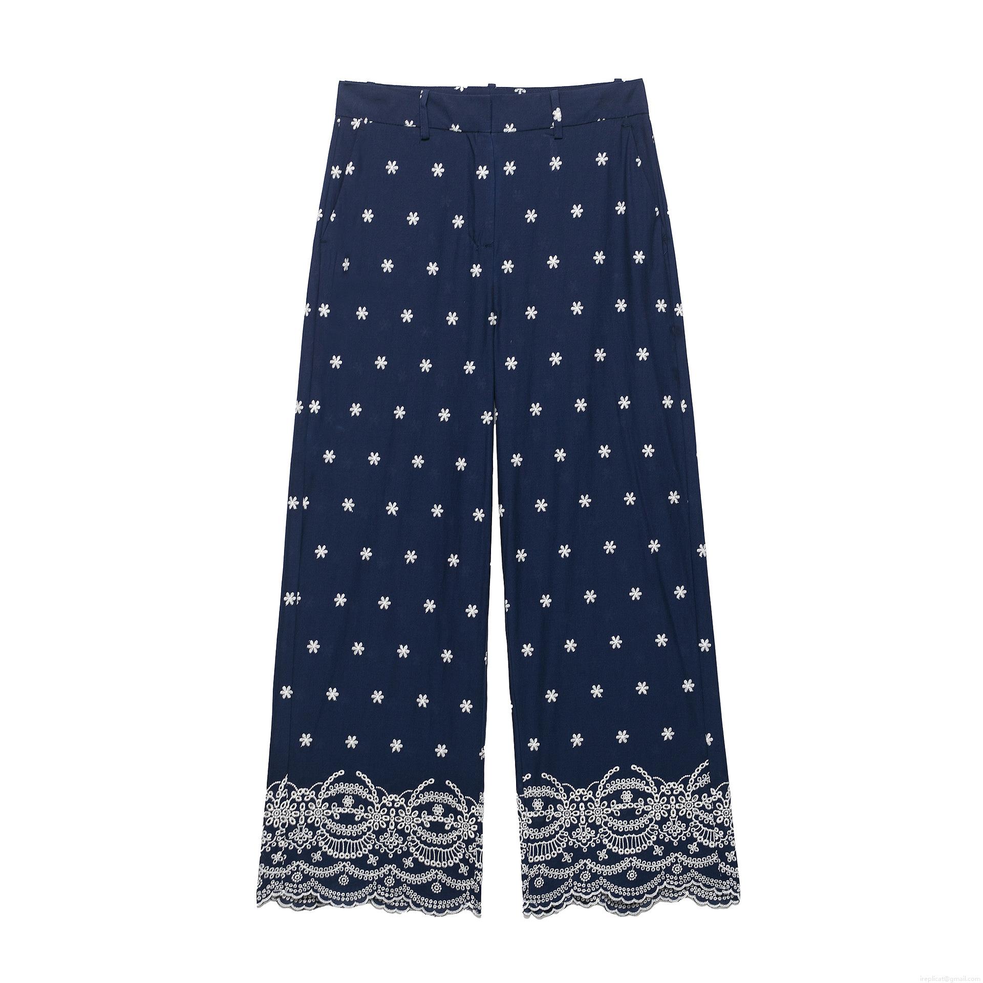 • Women's Two Piece Outfits Embroidery Eyelet Lace Long Sleeve Shirt And Wide Leg Pants Set Scalloped Edge Hollow Out Casual Streetwear Navy Blue