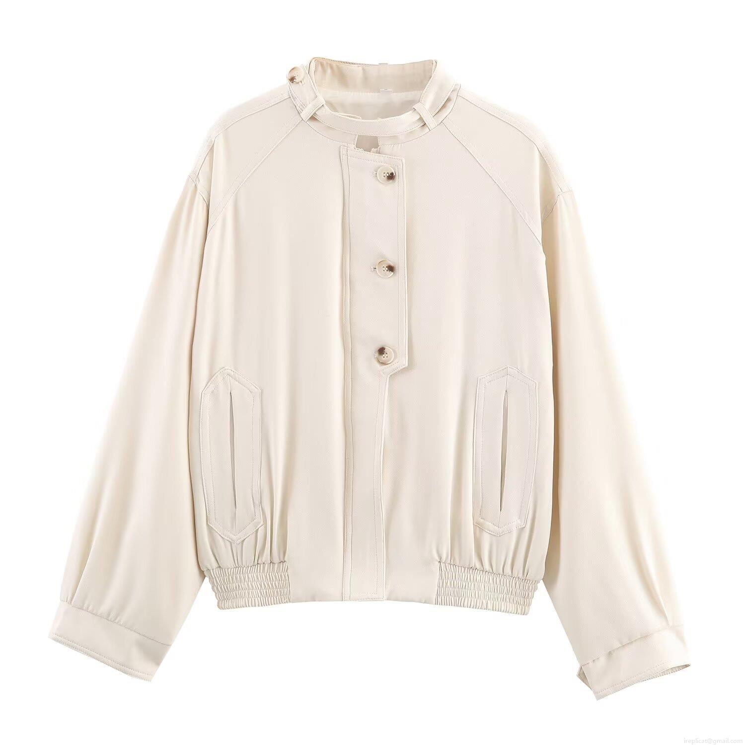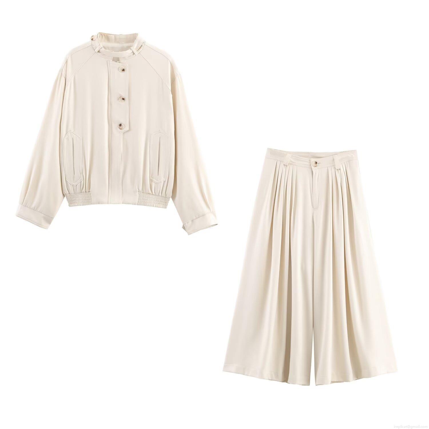 • Women's Two Piece Pants Set Casual Solid Color Stand Collar Button Jacket And High Waist Pleated Wide Leg Trousers Autumn Fashion Loose Long Sleeve Outfits