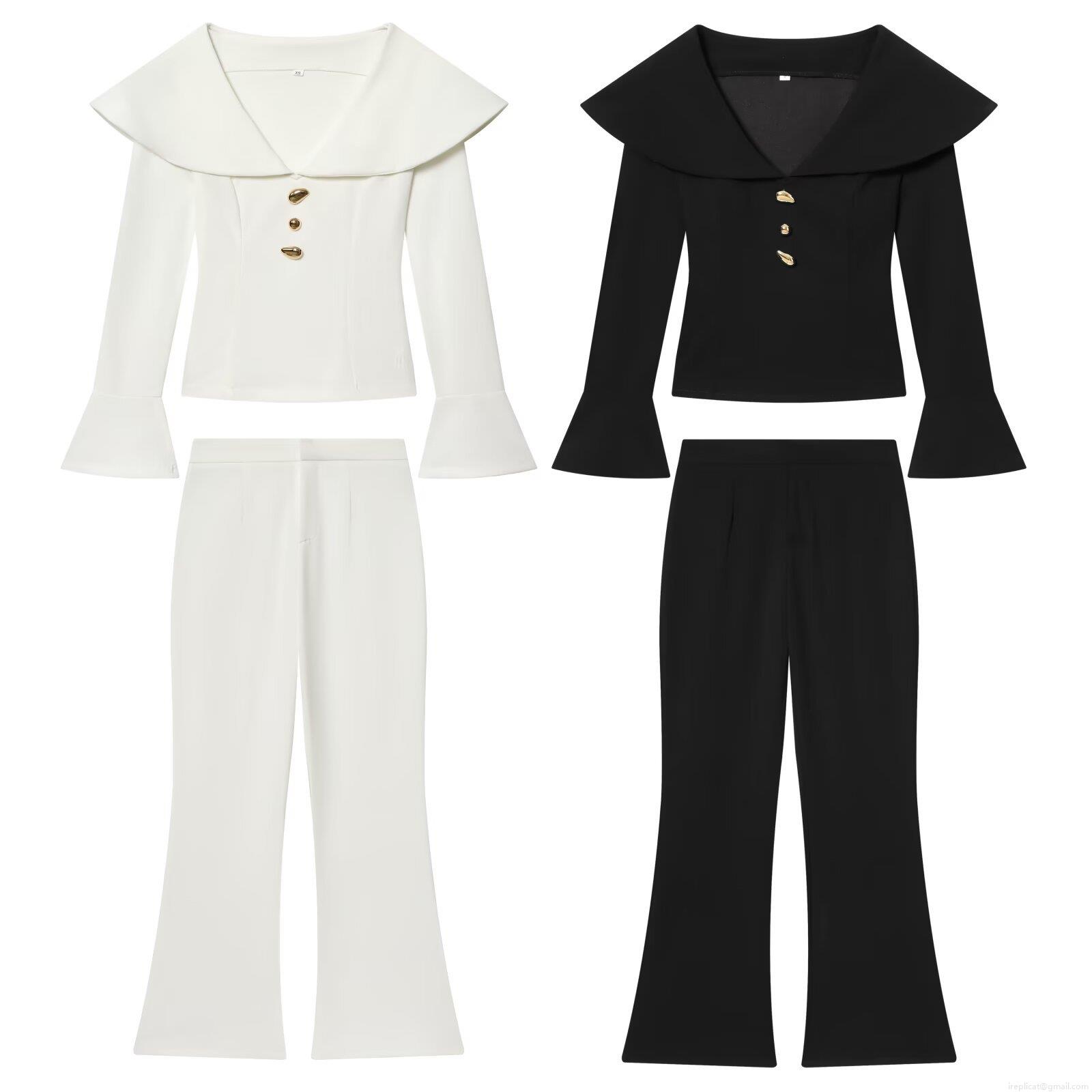 • Women's Two Piece Pants Set Elegant Polyester Long Sleeve Lapel Top With Golden Buttons Flare Leg Trousers For Office Commute Business Fashion Outfits