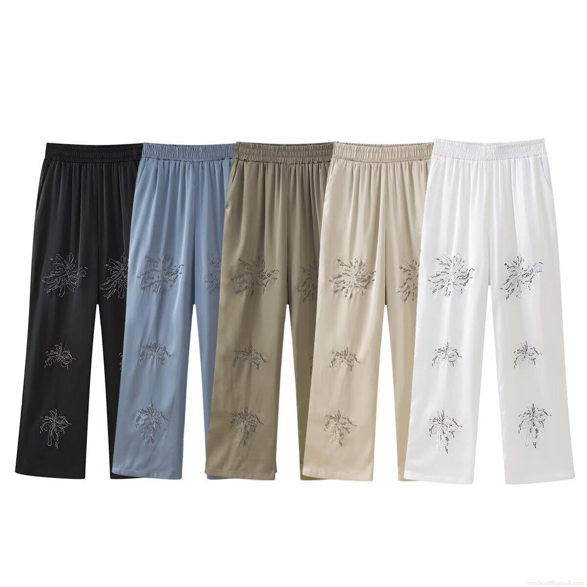 Women's Two Piece Pants Set Elegant Satin Floral Embroidered Beading Long Sleeve Shirt High Waist Wide Leg Trousers Casual Outfits