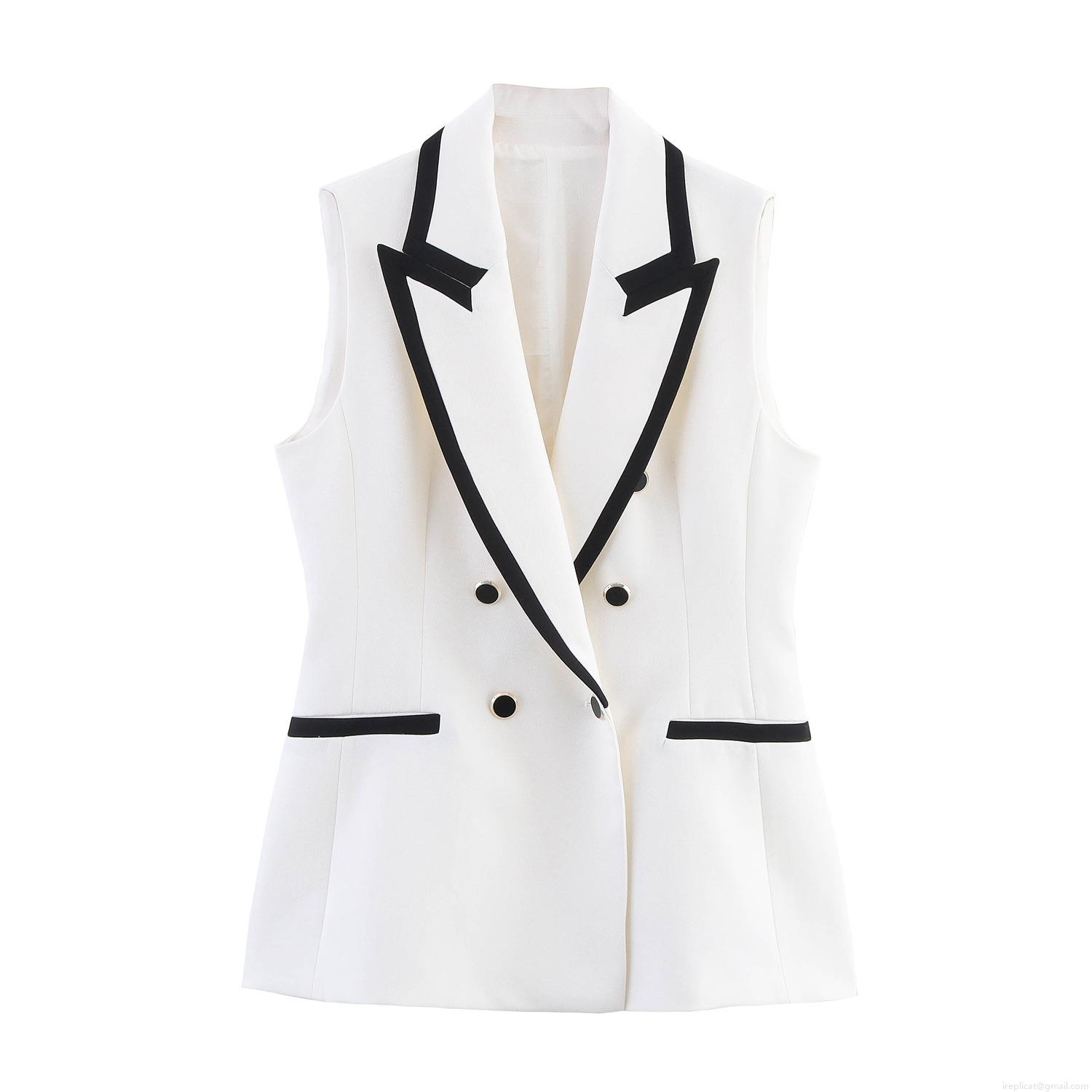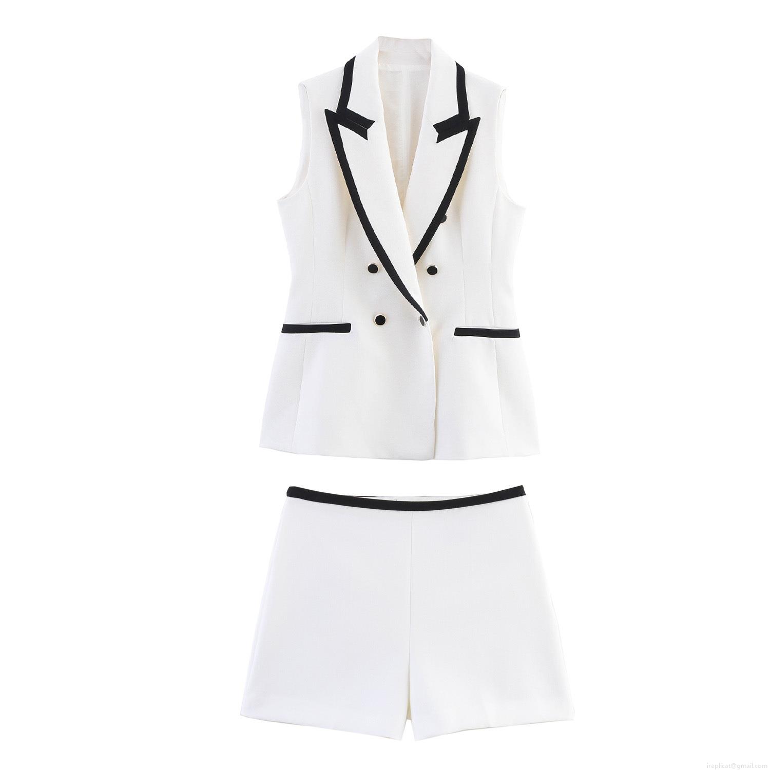 • Women's Two Piece Set Contrast Trim Sleeveless Vest and Shorts Suit Double Breasted V-Neck Polyester Blend Elegant OL Style Office Commute Outfit For Ladies