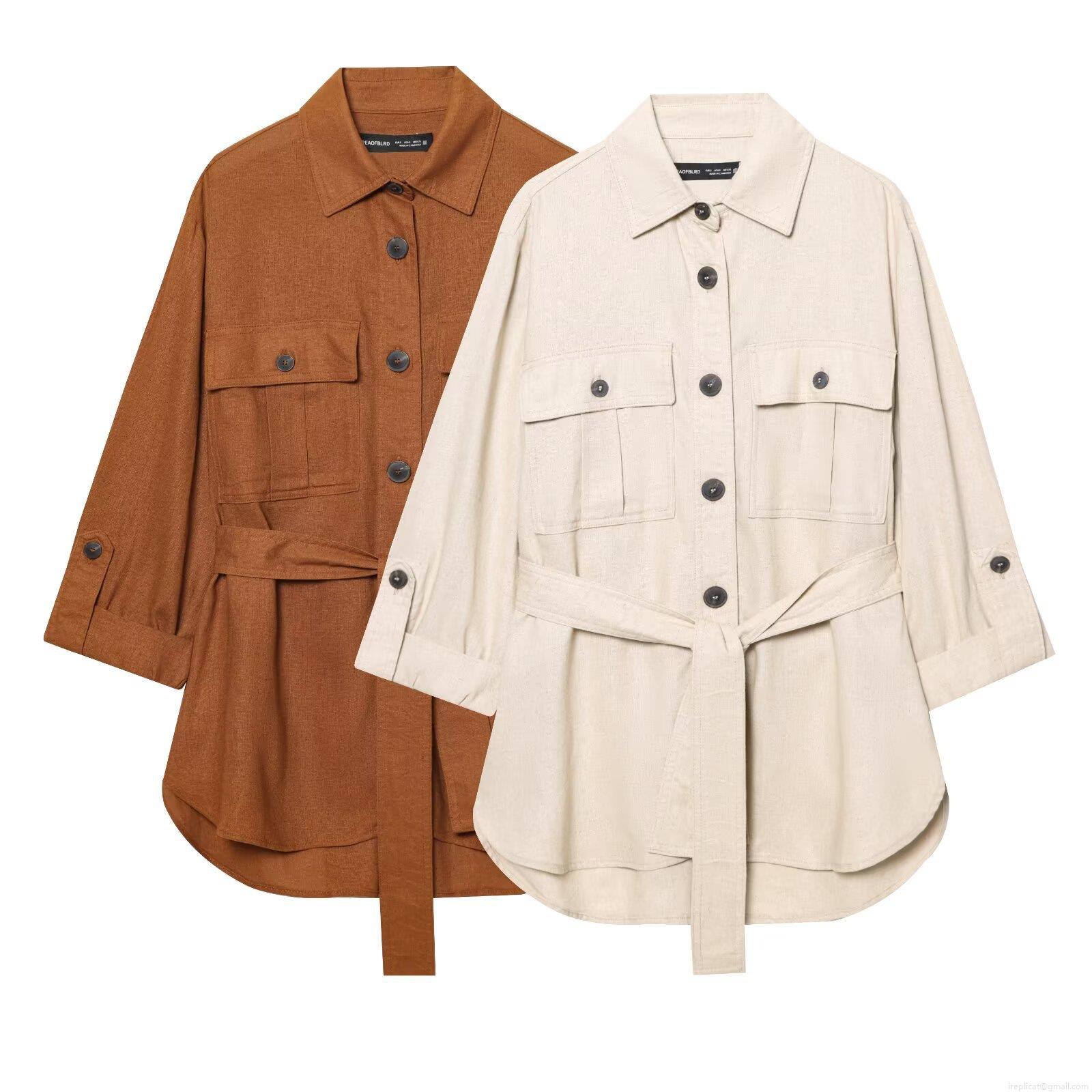 • Women's Two Piece Set Cotton Linen Blend Long Sleeve Belted Cargo Shirt and Straight Leg Pants Suit Casual Streetwear Workwear Elegant Outfit for Women