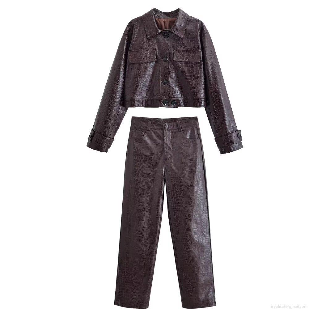 • Women's Two Piece Set Crocodile Embossed Faux Leather Jacket and High Waist Straight Pants Outfits Retro PU Streetwear Suit