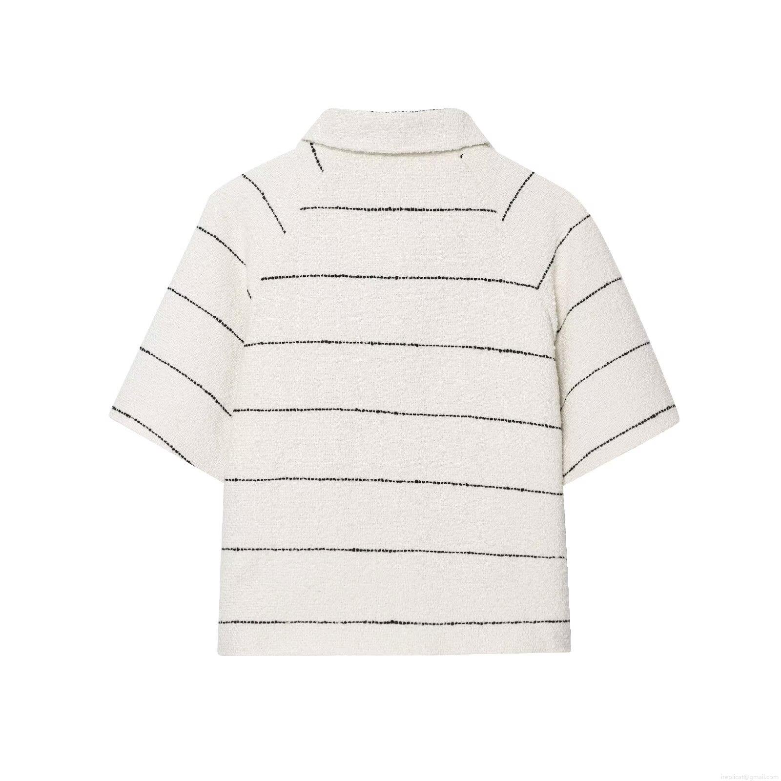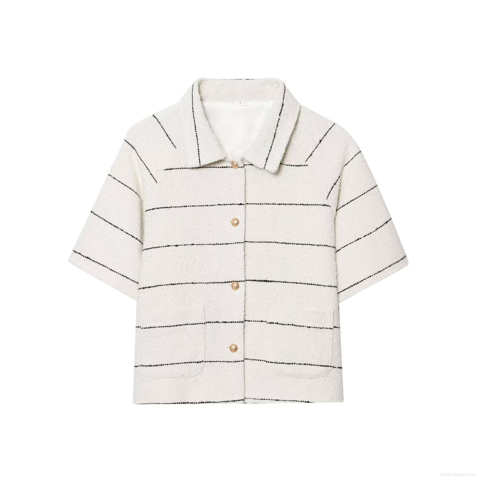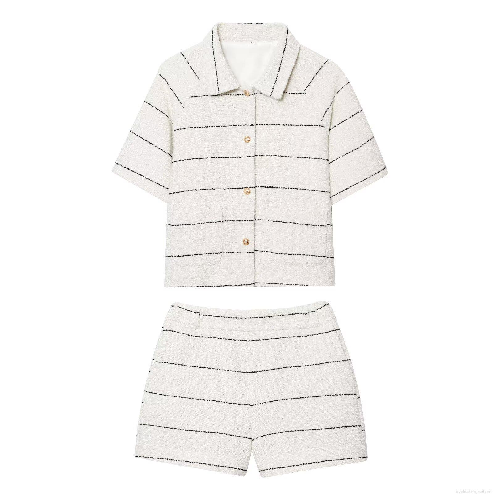 Women's Two Piece Set Elegant Striped Tweed Short Sleeve Blazer Jacket and Shorts Set With Gold Buttons Elegant Office Lady Outfit White Black Suit