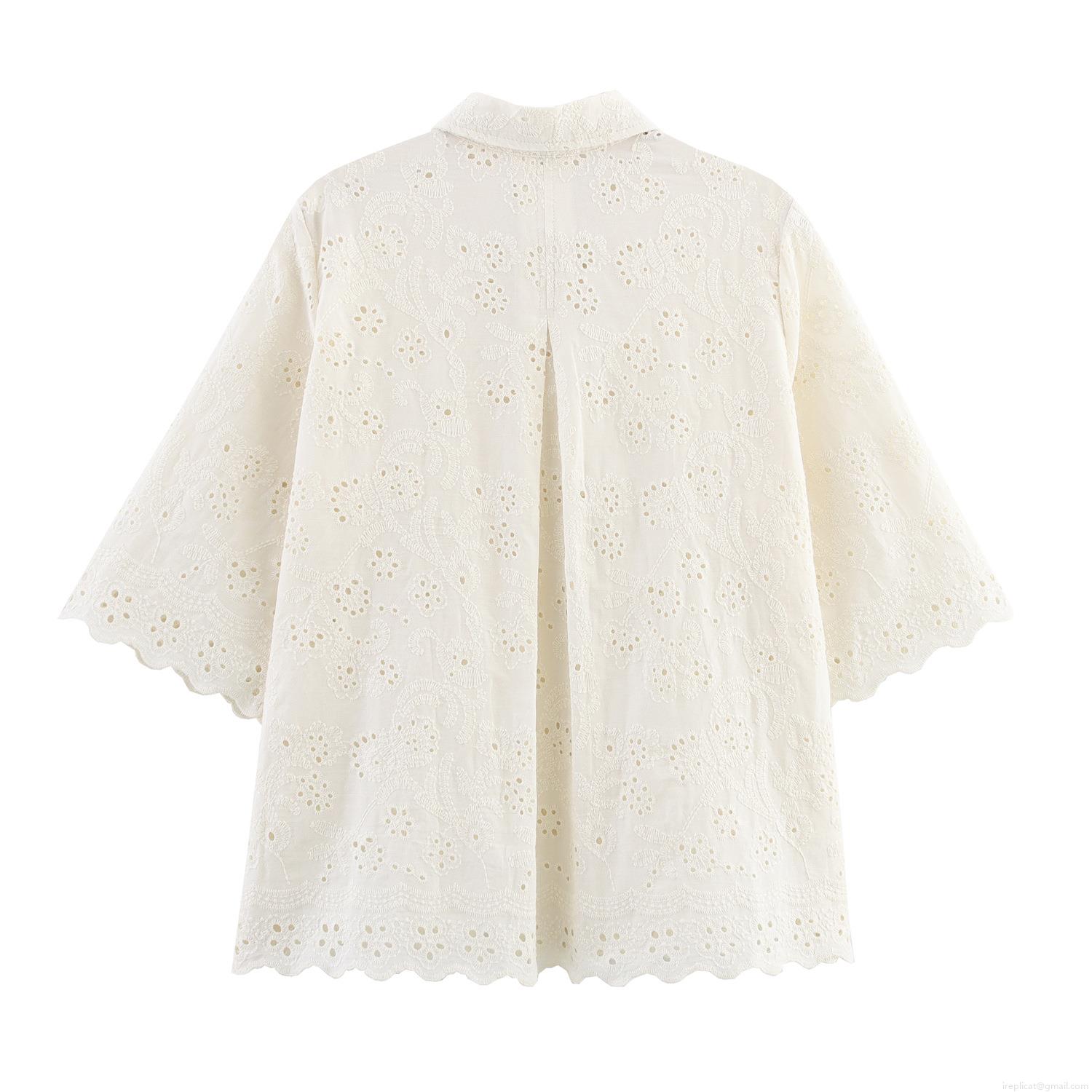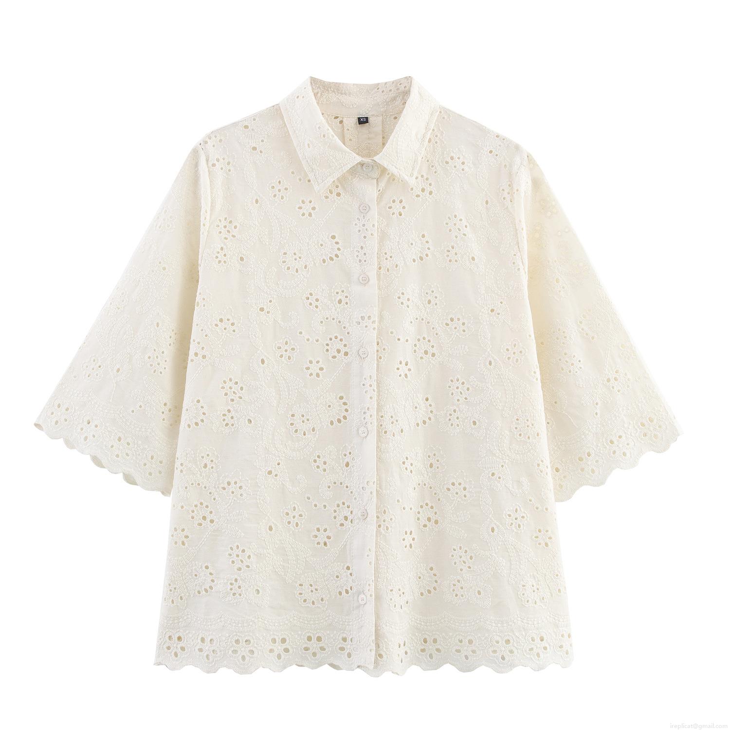 Women's Two Piece Set Embroidered Hollow Out Short Sleeve Shirt And High Waist Straight Leg Pants White Cotton Blend Lace Blouse Casual Streetwear Retro Outfit