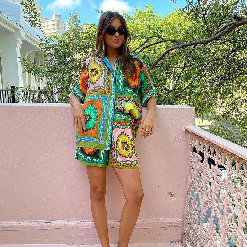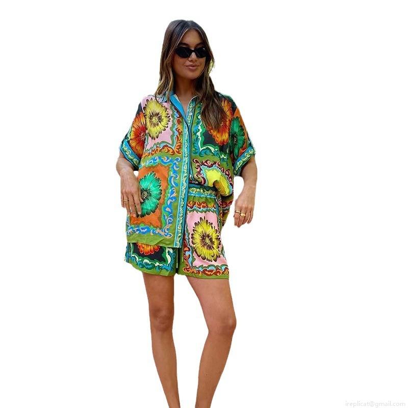 • Women's Two Piece Set Floral Print Linen Blend Casual Short Sleeve Button Down Shirt and High Waist Shorts Summer Vacation Beach Outfit