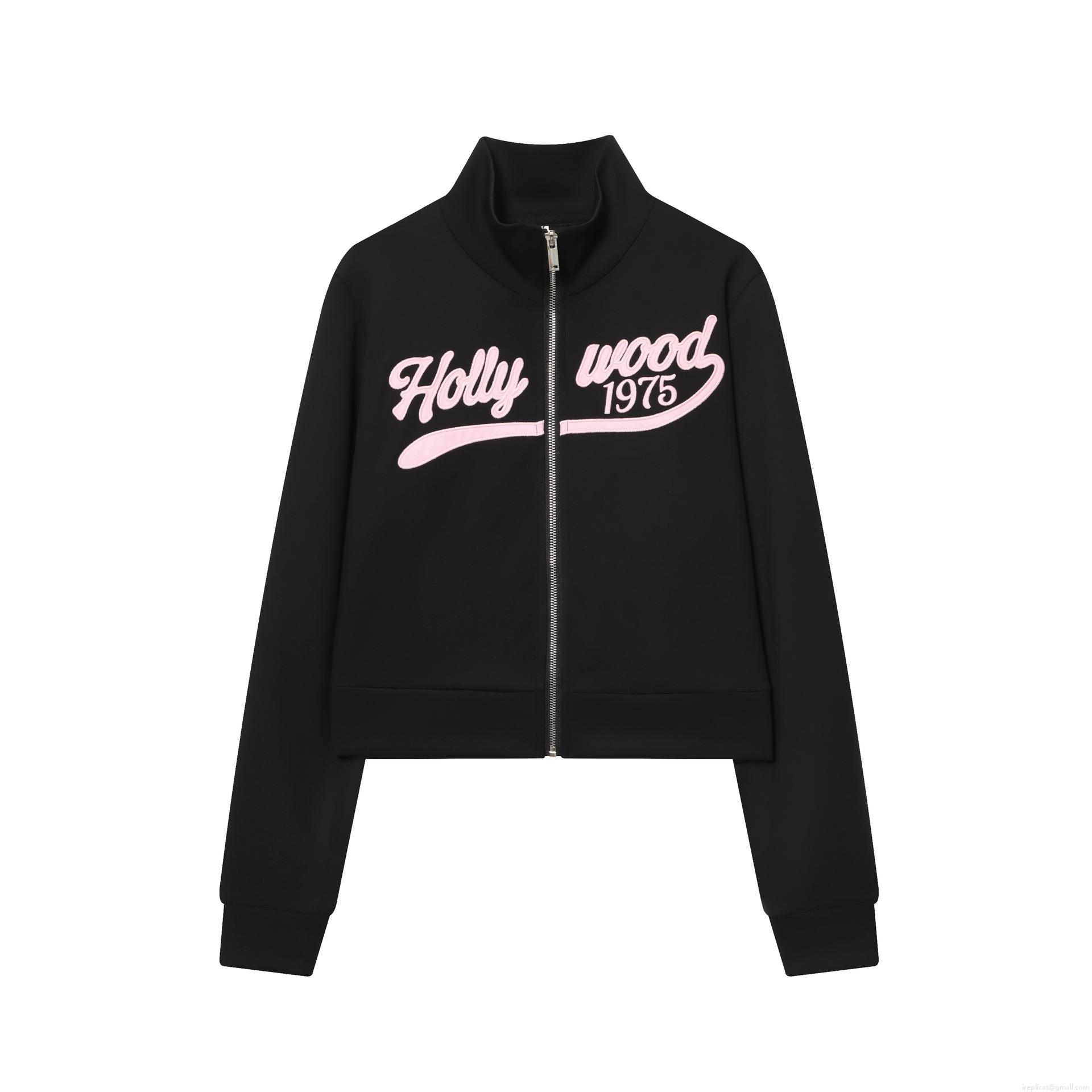 Women's Two Piece Set Hollywood 1975 Embroidery Stand Collar Zip Up Sweatshirt Top And Flared Pants Tracksuit Streetwear Casual Sportswear