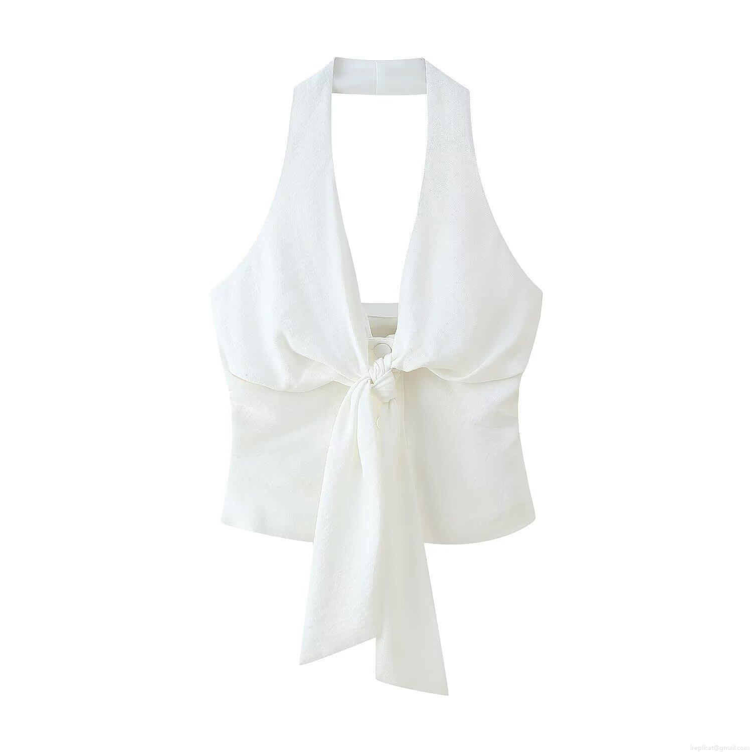 Women's Two Piece Set Sexy Halter Knotted Crop Top And High Waist Pleated Wide Leg Pants Solid White Polyester Casual Streetwear Suit